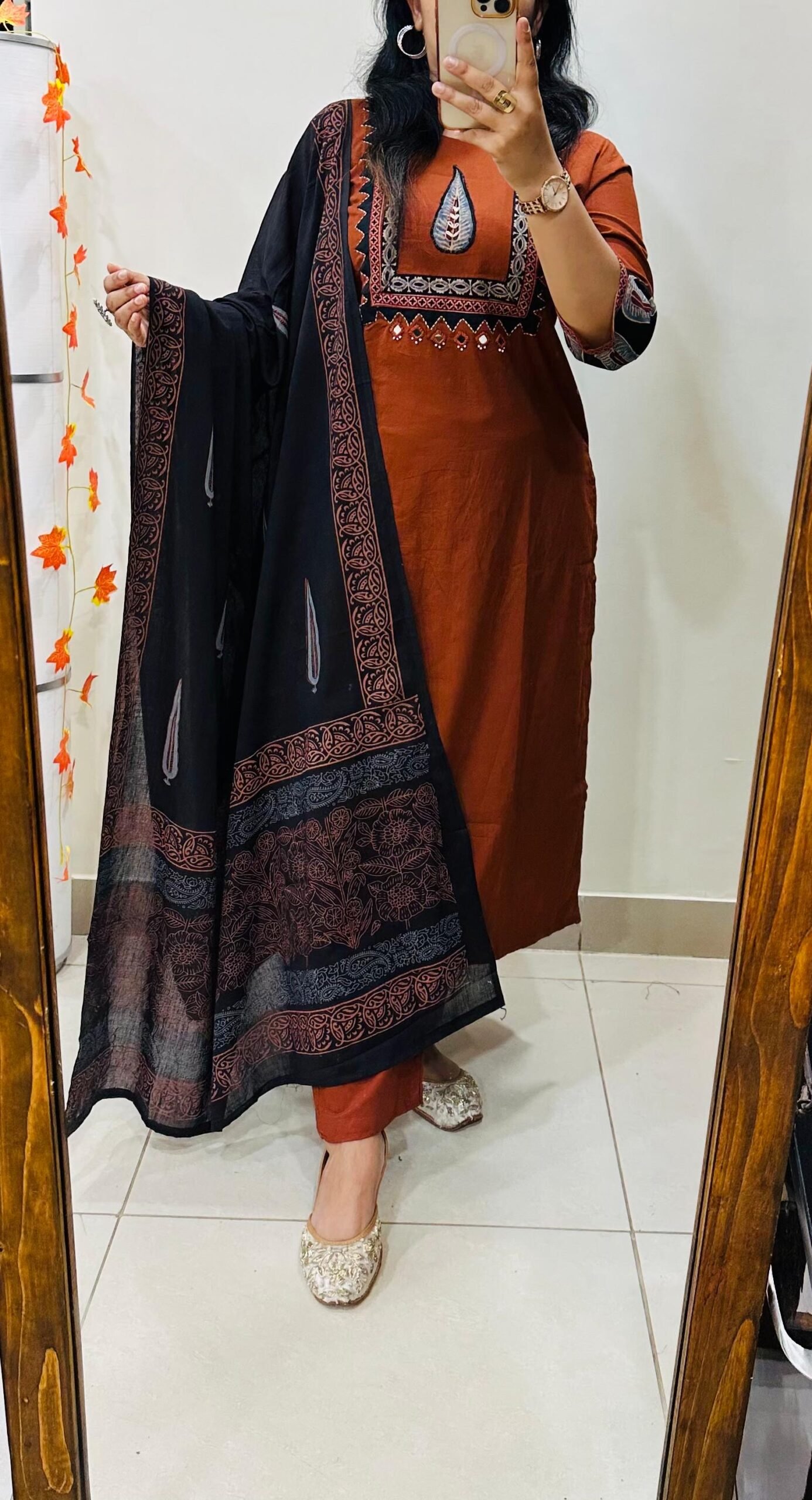 Best Seller Suit in Premium Dhabu Cotton Fabric With in straight Pattern with Applique work mirror work… With dhabu cotton pants & Ajrakh dupatta….