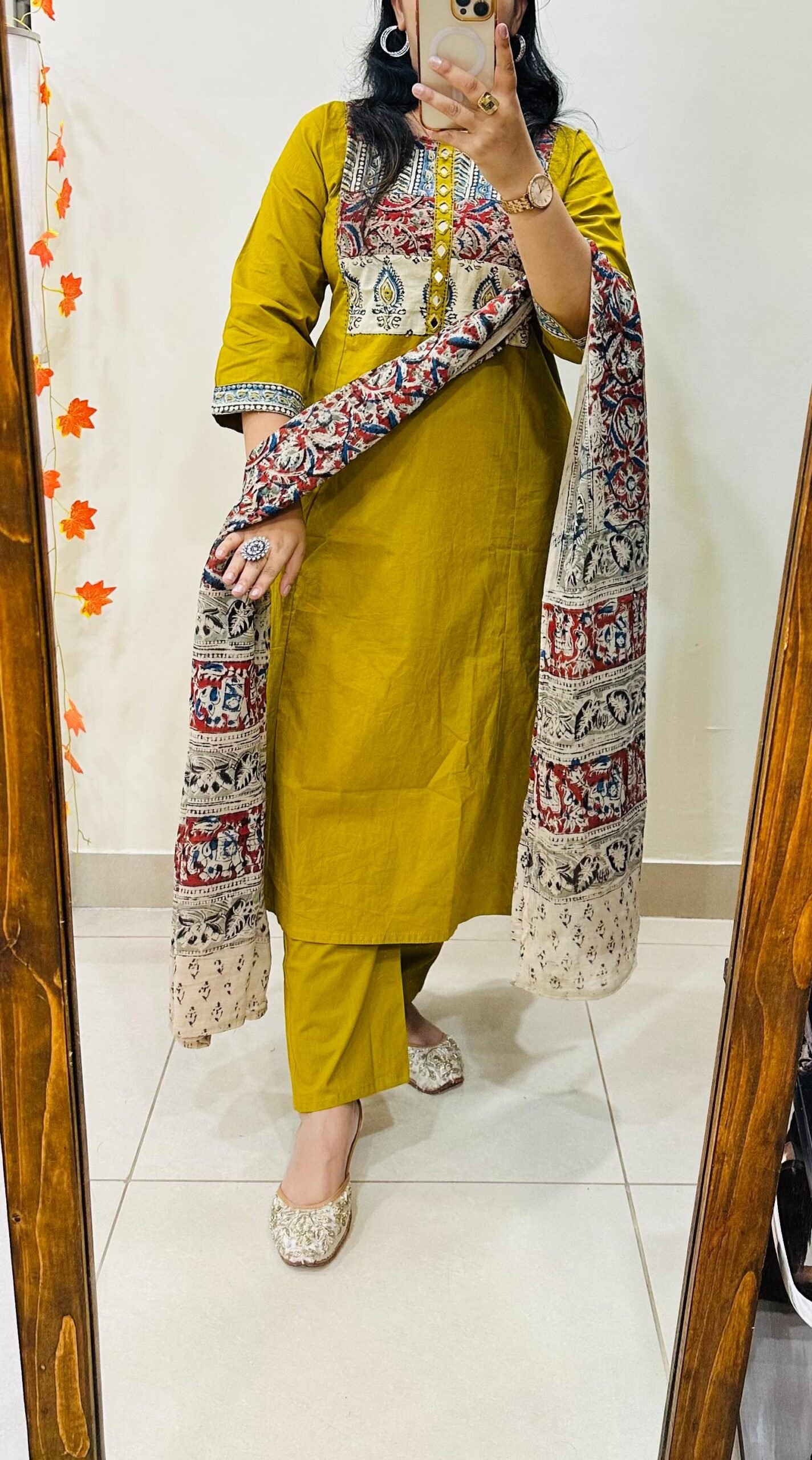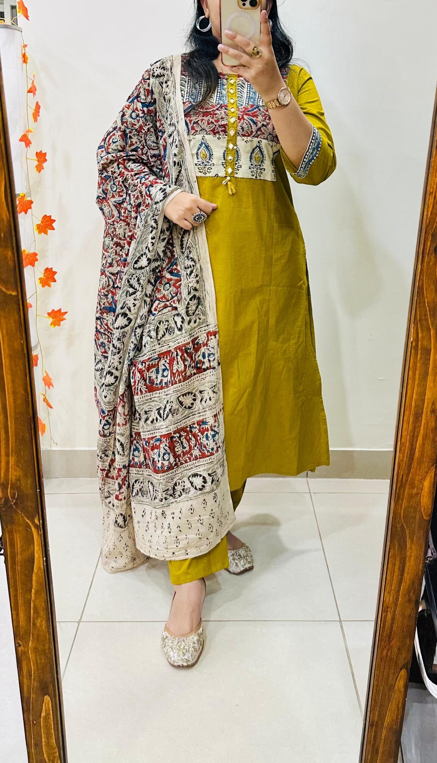 Beautiful kurti Palazzodupatta set in Premium Dhabu Cotton in Kalamkari in yoke with real mirror and sequin detailing with kalamkari cotton dupatta