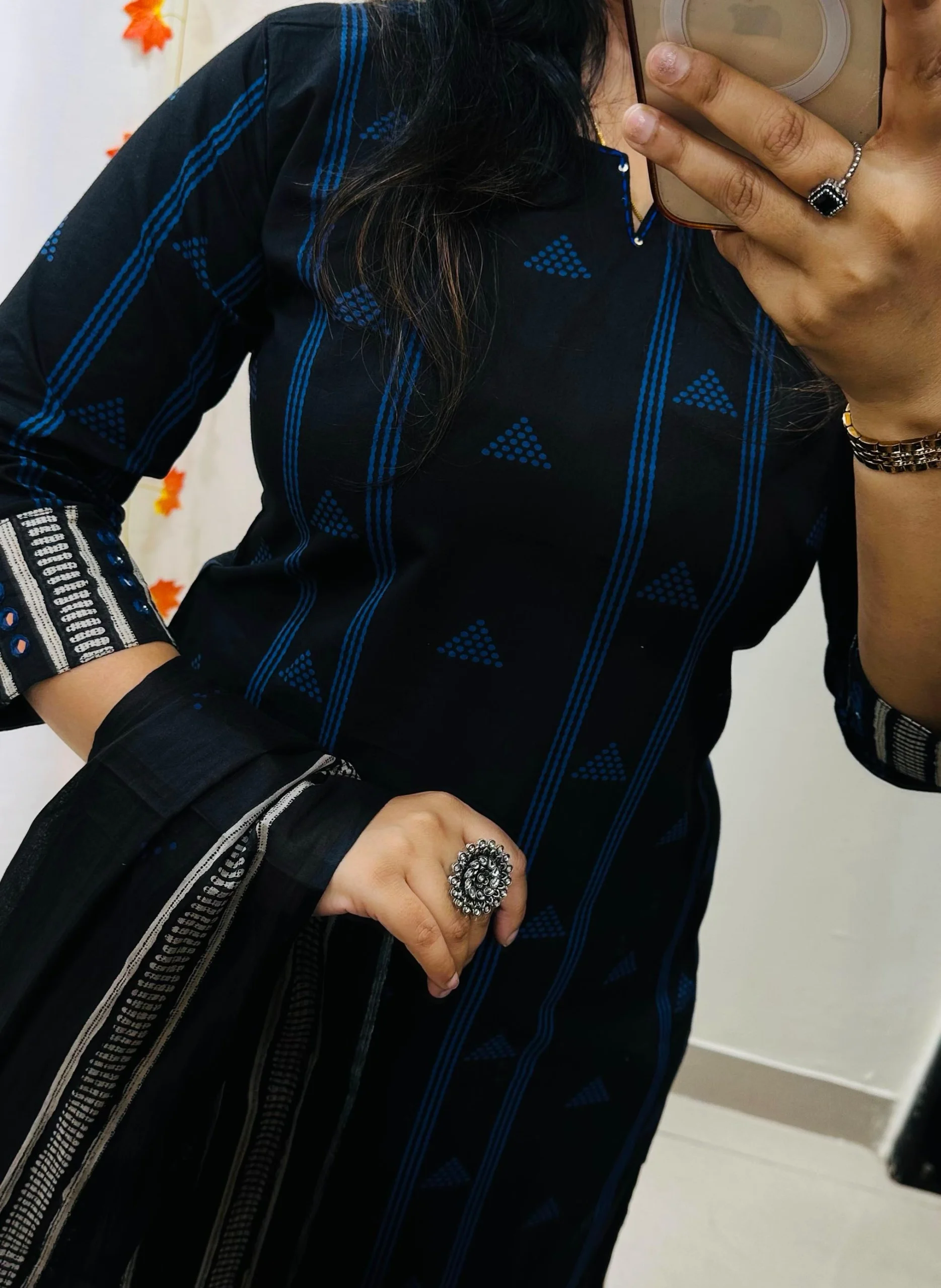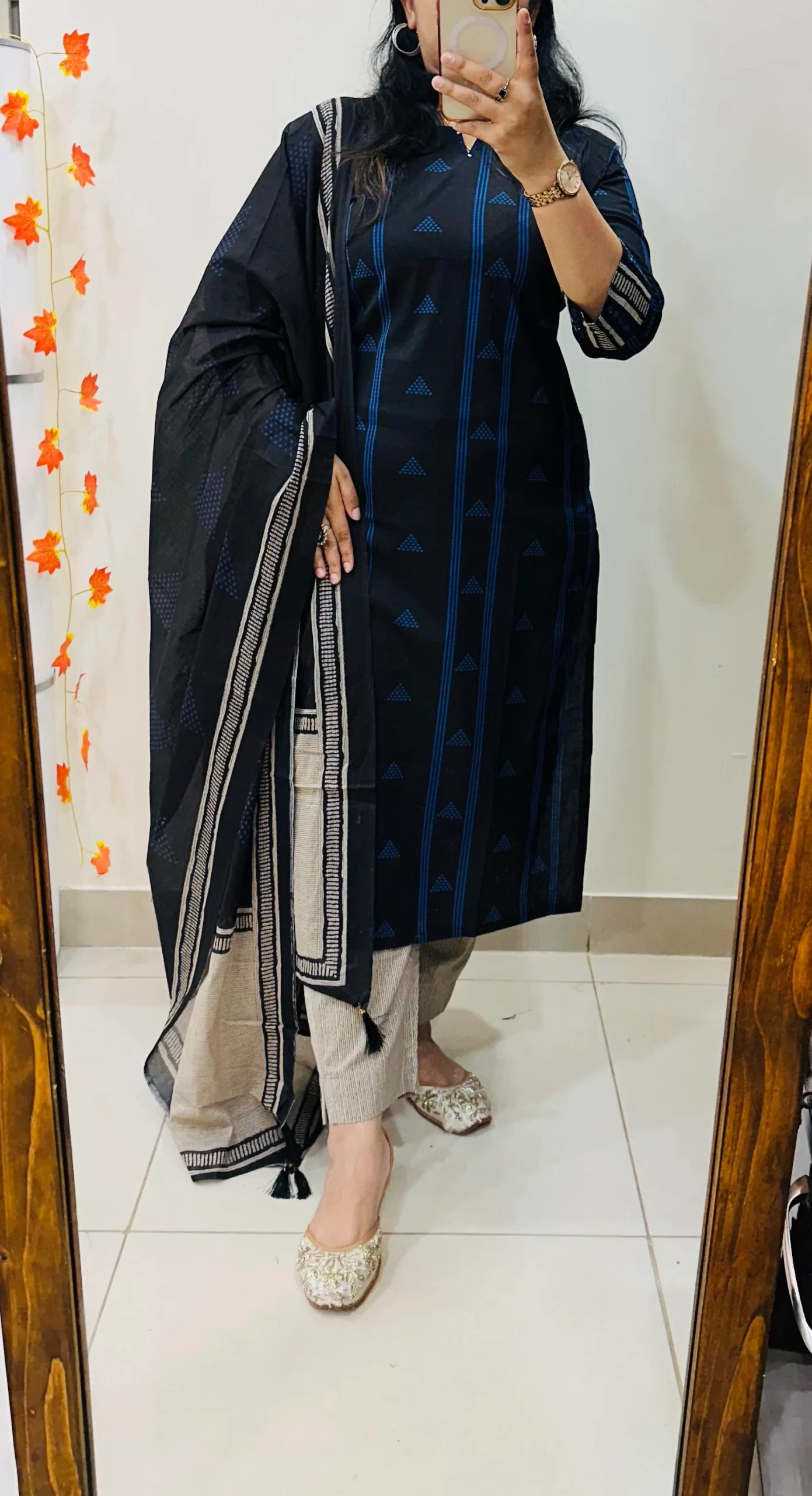 Beautiful kurti pant dupatta set in Premium Fine Cotton with thread sequin detailing work in neckline and real mirror work in sleeves….paired with fine cotton dupatta with tussels