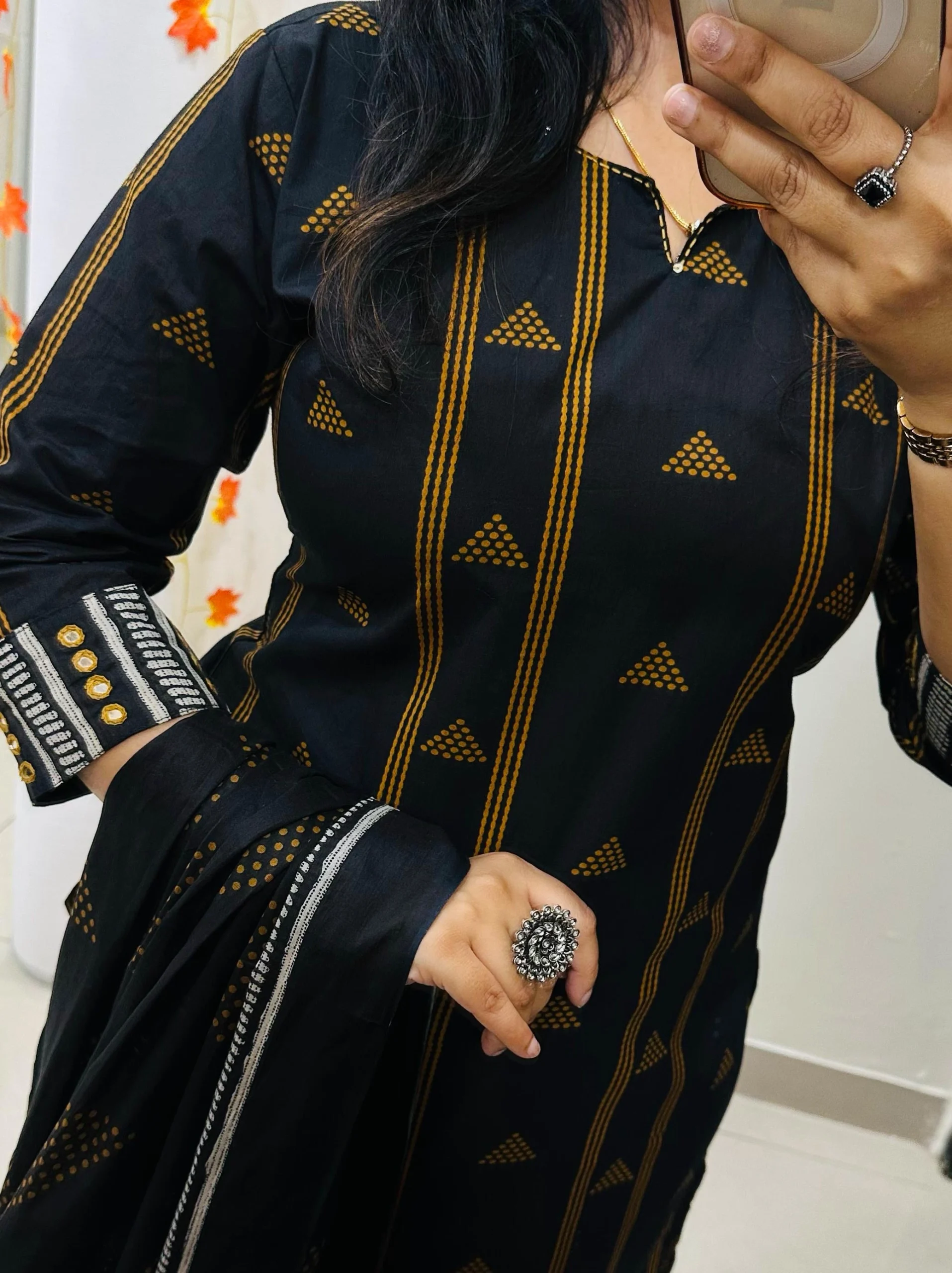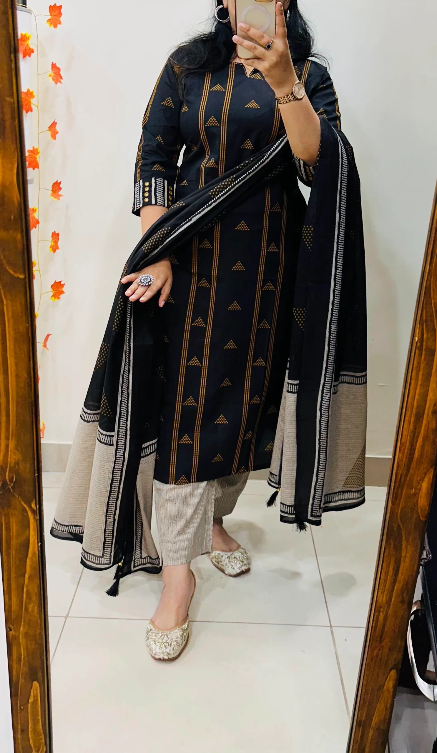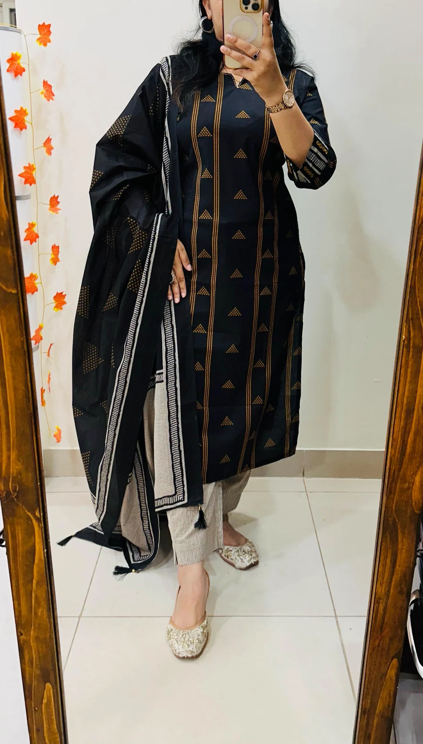 Beautiful kurti pant dupatta set in Premium Fine Cotton with thread sequin detailing work in neckline and real mirror work in sleeves….paired with fine cotton dupatta with tussels
