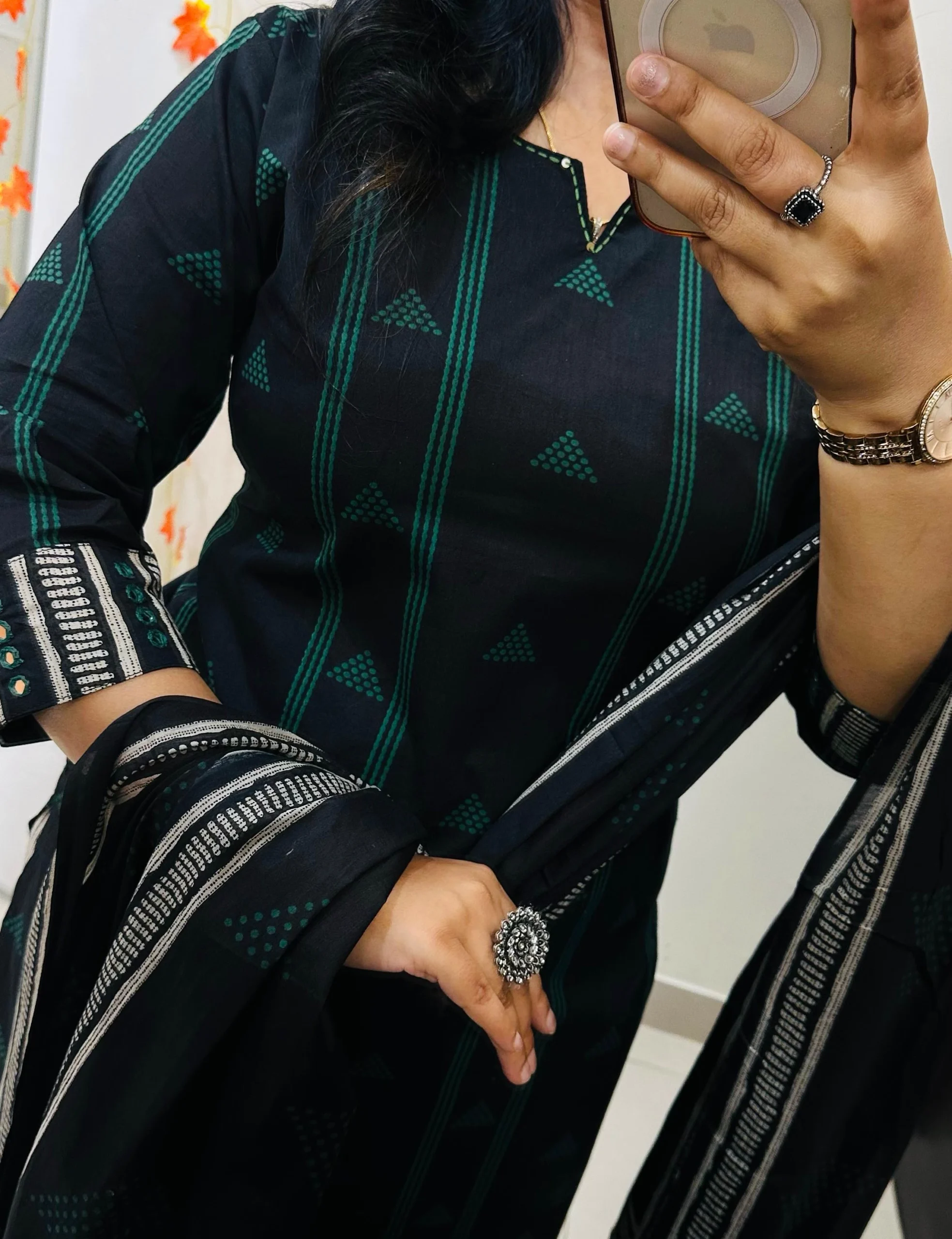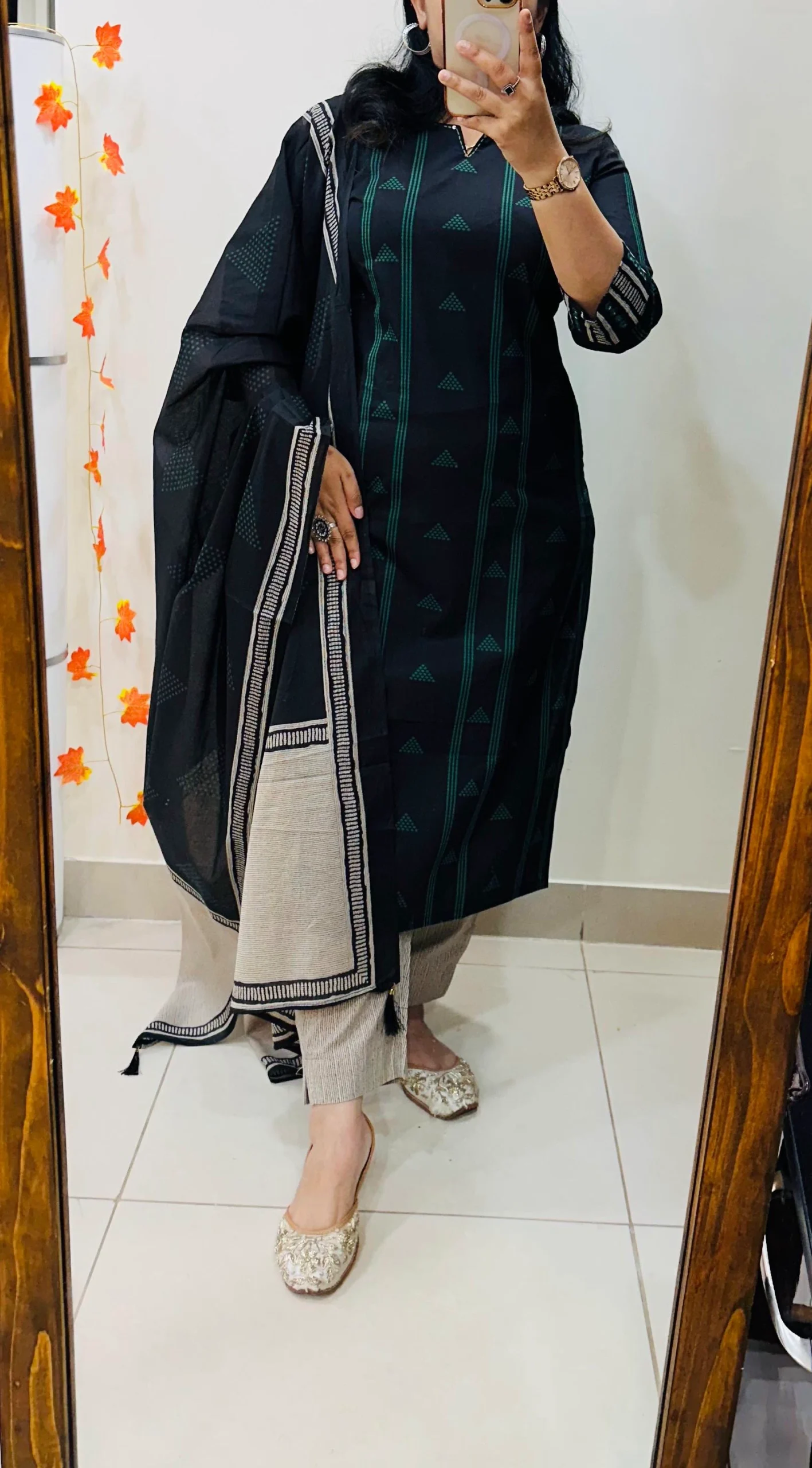 Beautiful kurti pant dupatta set in Premium Fine Cotton with thread sequin detailing work in neckline and real mirror work in sleeves….paired with fine cotton dupatta with tussels