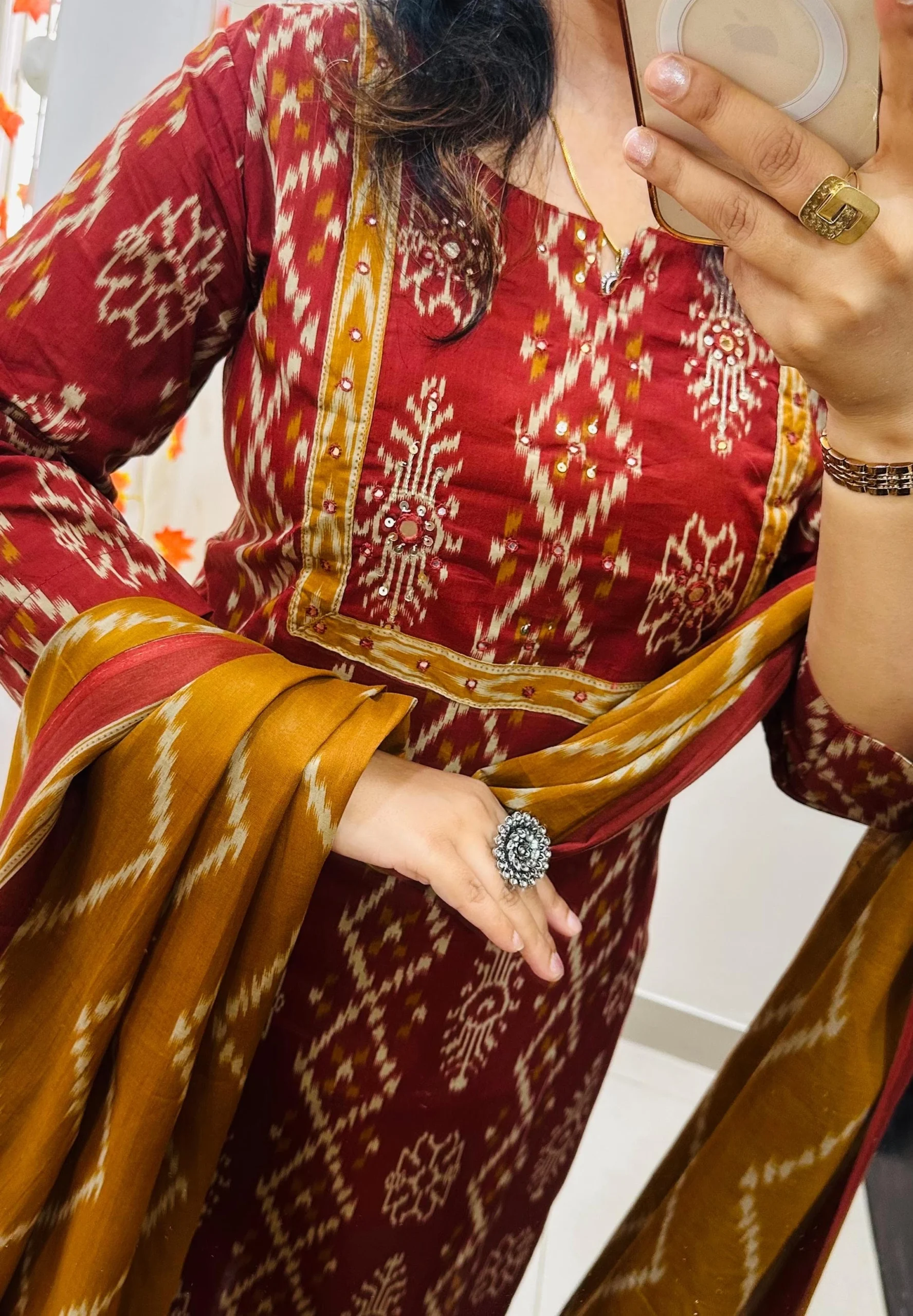 Beautiful Designer kurti pant dupatta set in Premium Fine Cotton with real mirror work in neckline and all over kurti paired with fine cotton dupatta with tussels