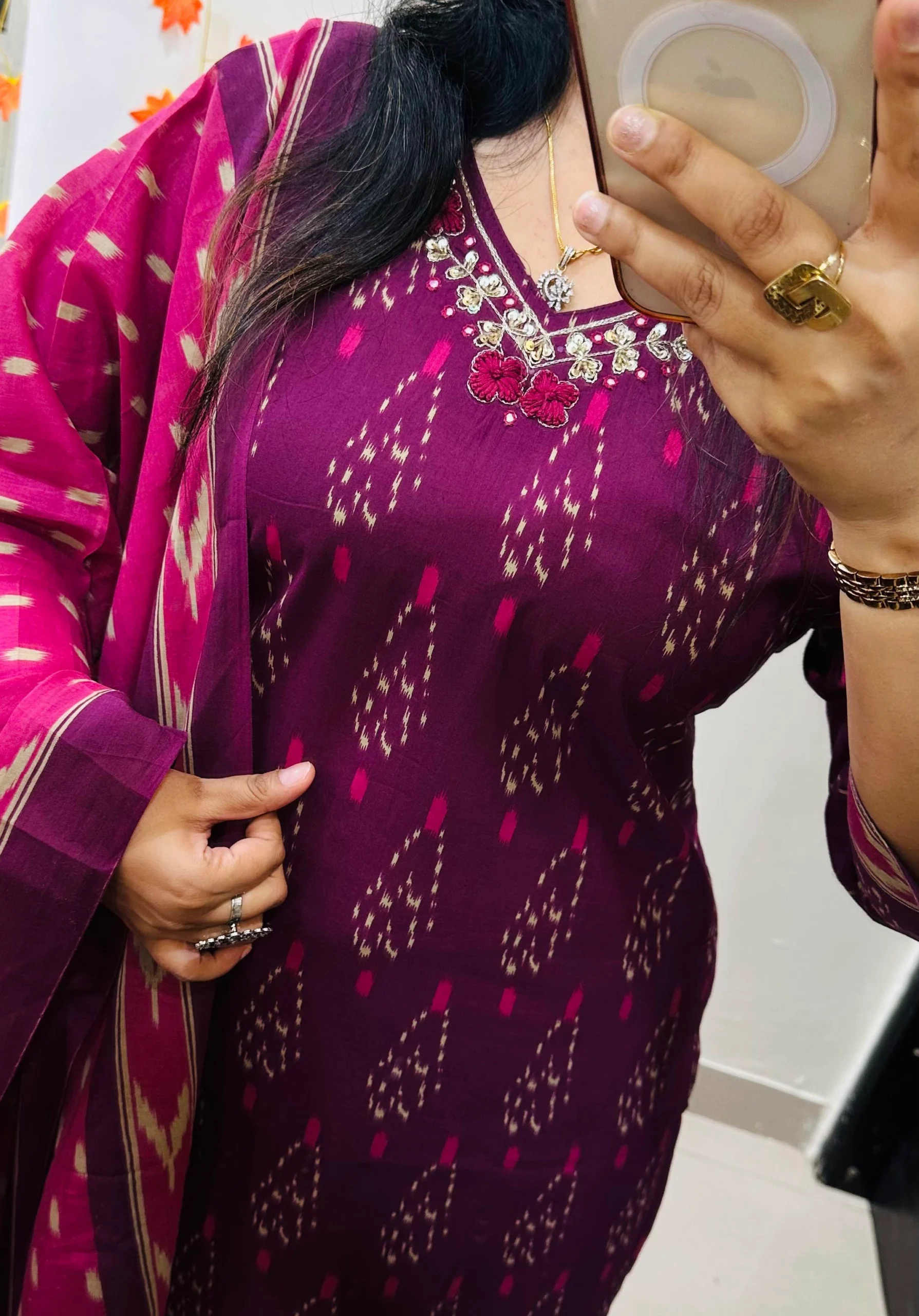 Beautiful kurti pant dupatta set in Premium Fine Ikkat Cotton with heavy thread zari embroidery with sequin detailing work in yoke paired with fine cotton dupatta with tussels