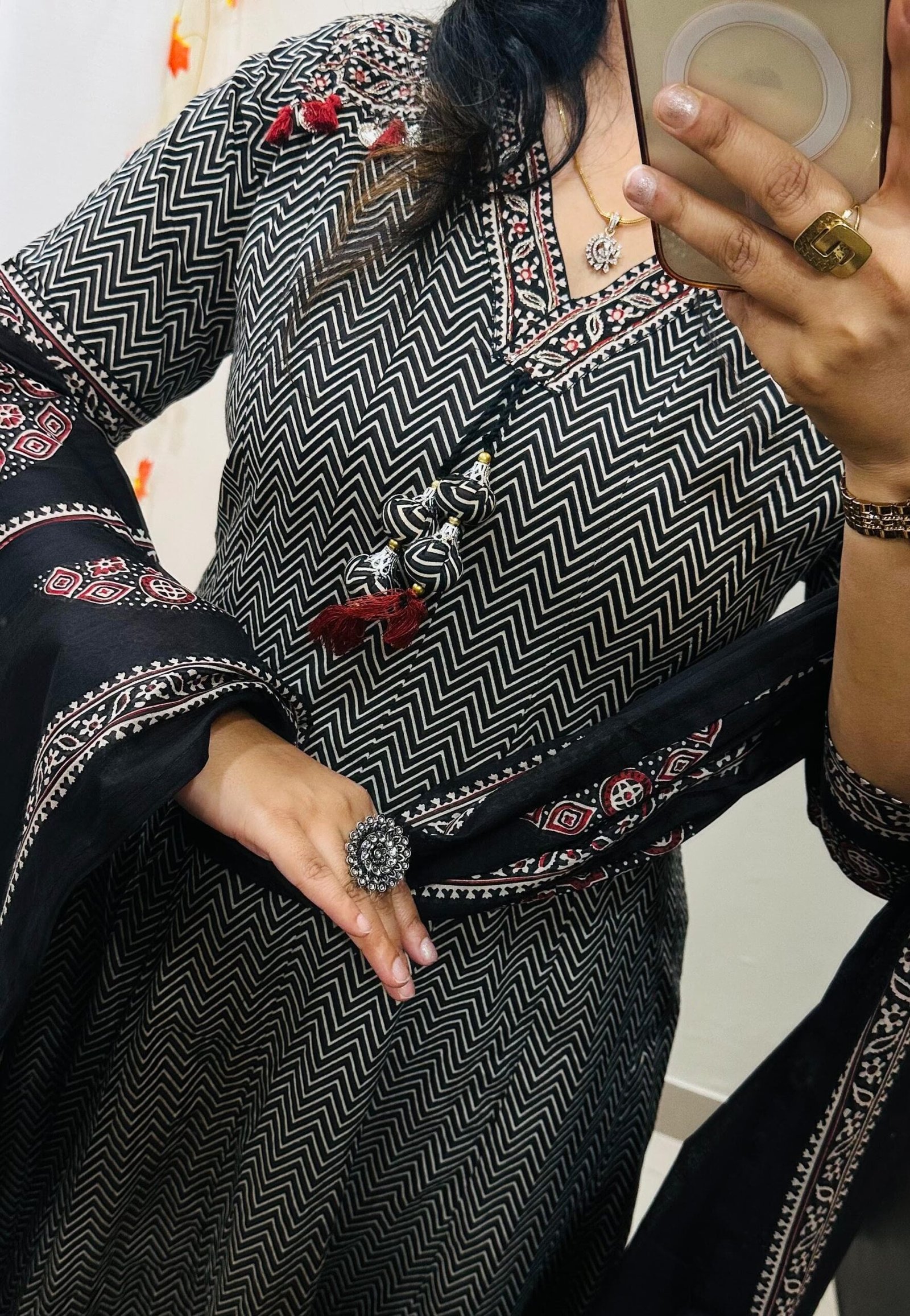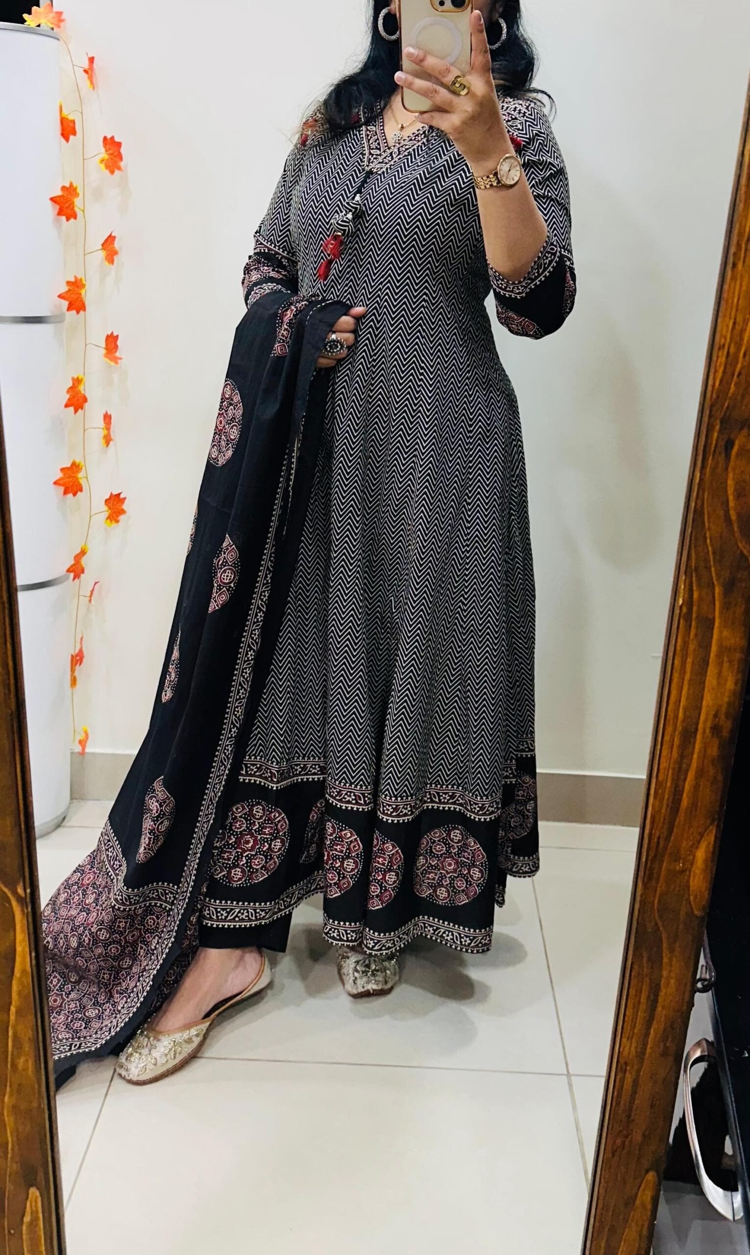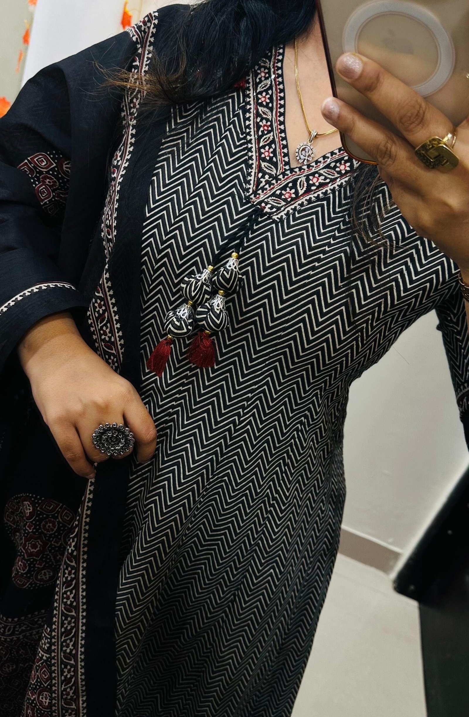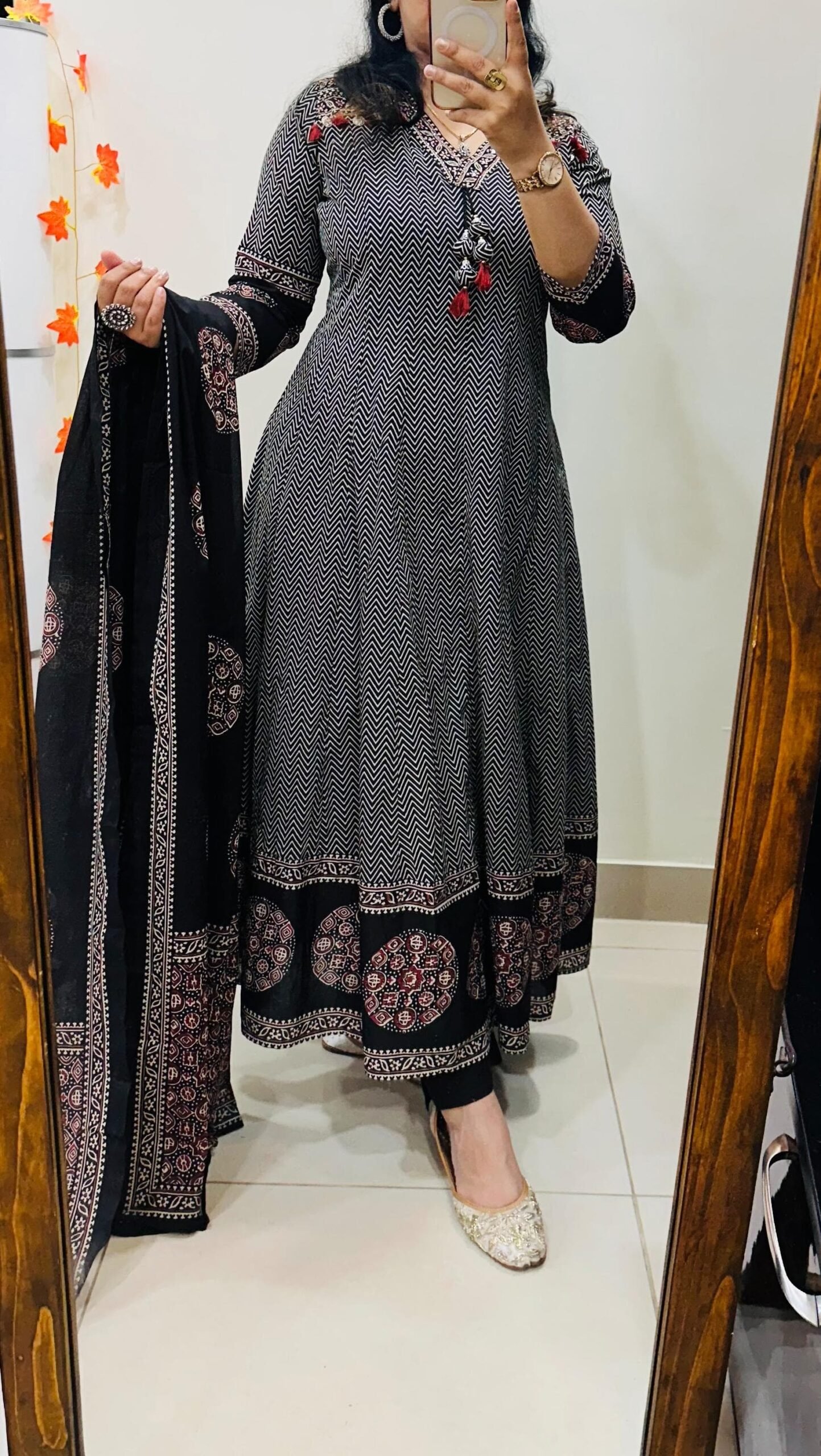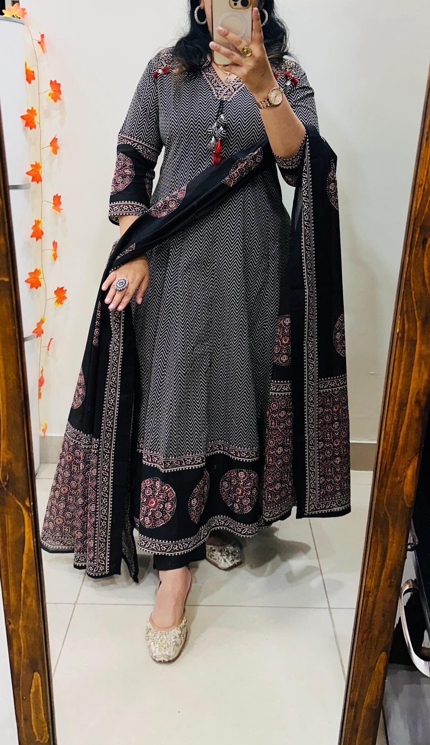 Famous Cotton Azrakh Anarkali Suit With pant duppata Set with heavy work in neckline with latkans ..tussels coin with zari embroidery sequjn detailing work in both shoulders