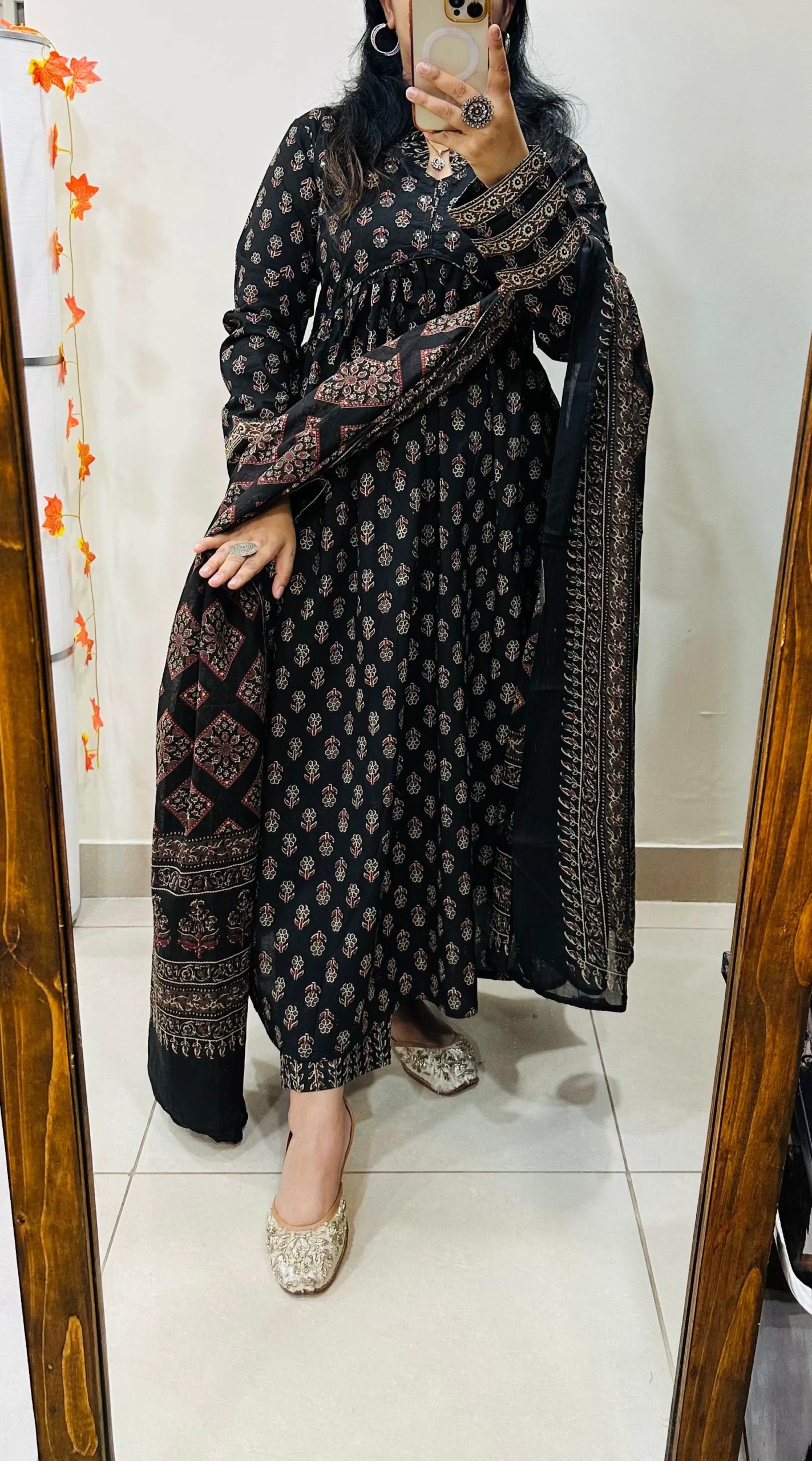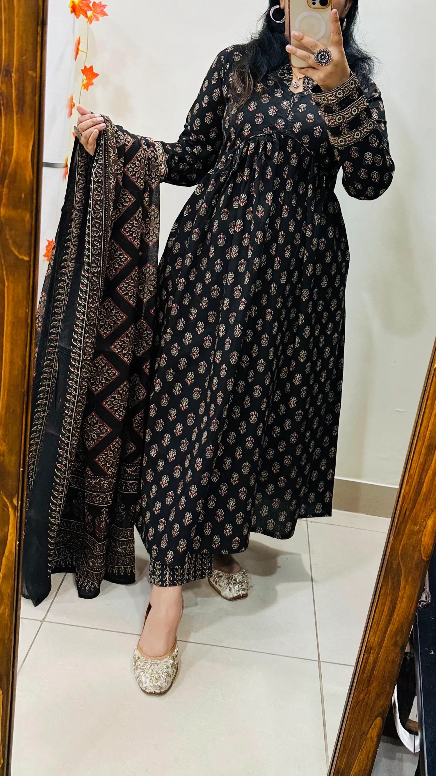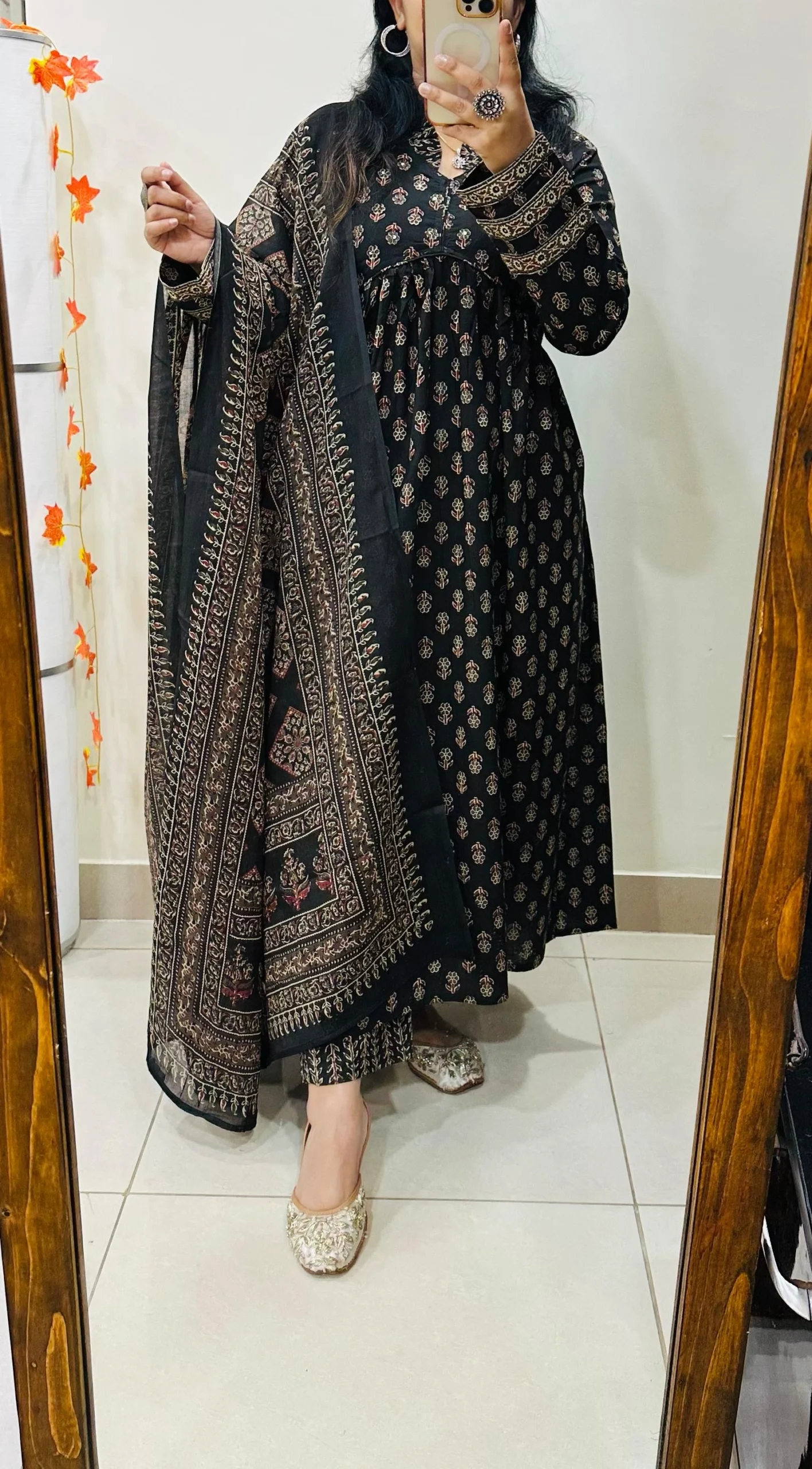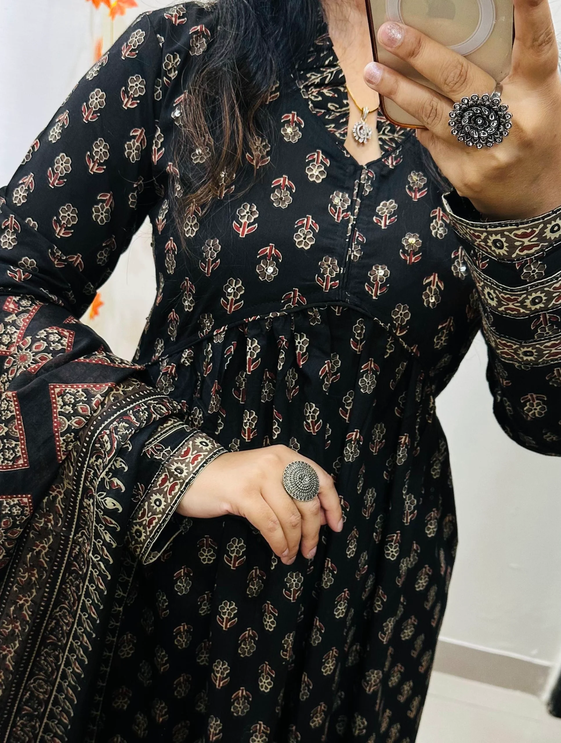 Unique Alia pattern and is accentuated with Sequin work on the yoke, giving it a distinctive touch. The suit set also showcases an exclusive Ajrakh Print, adding a cultural element to the design.