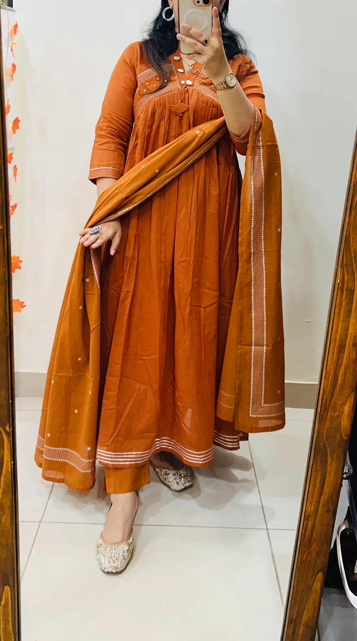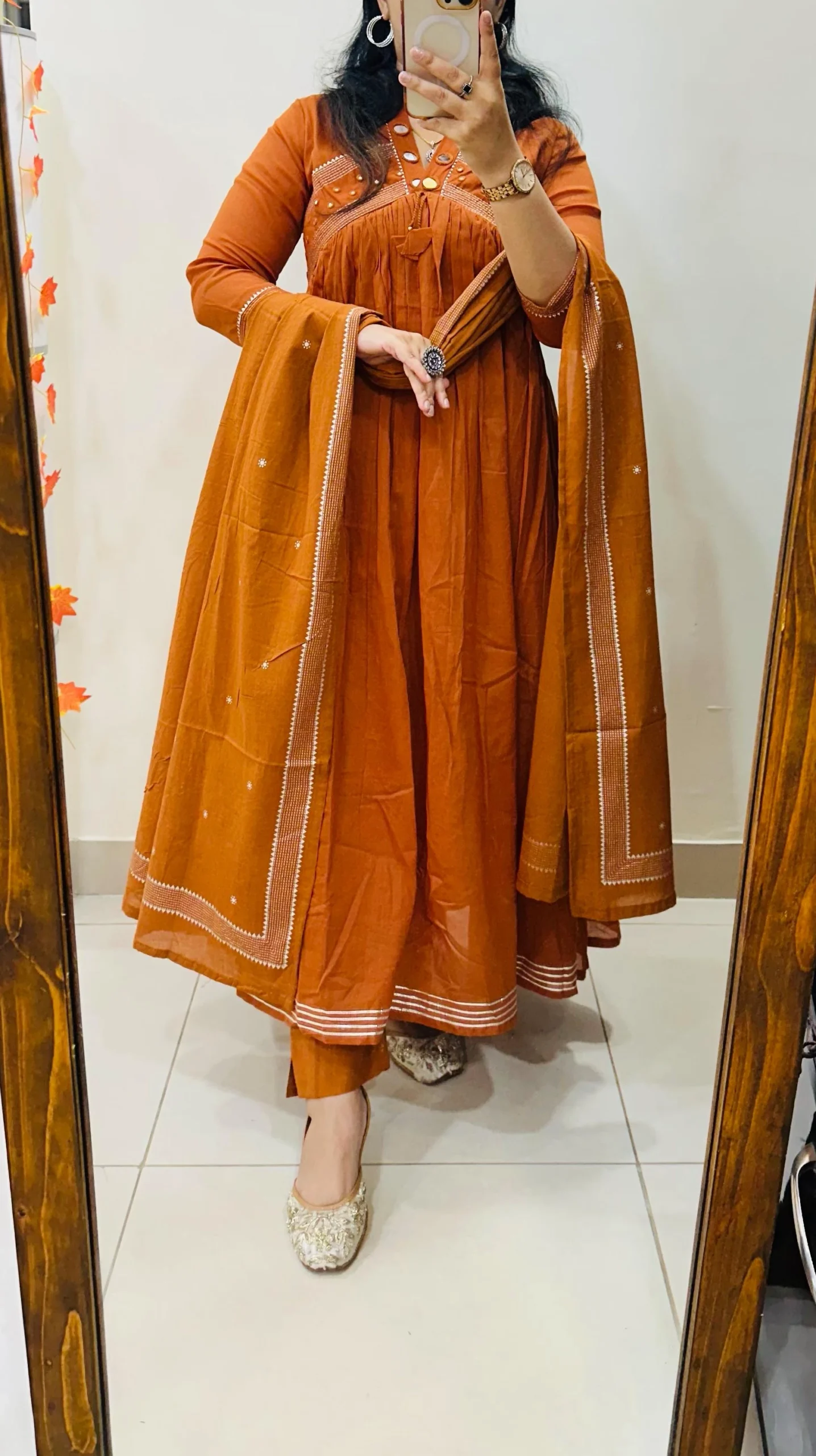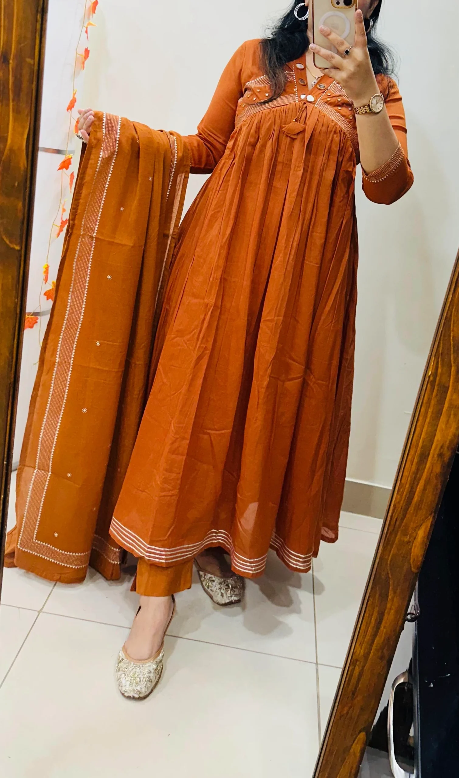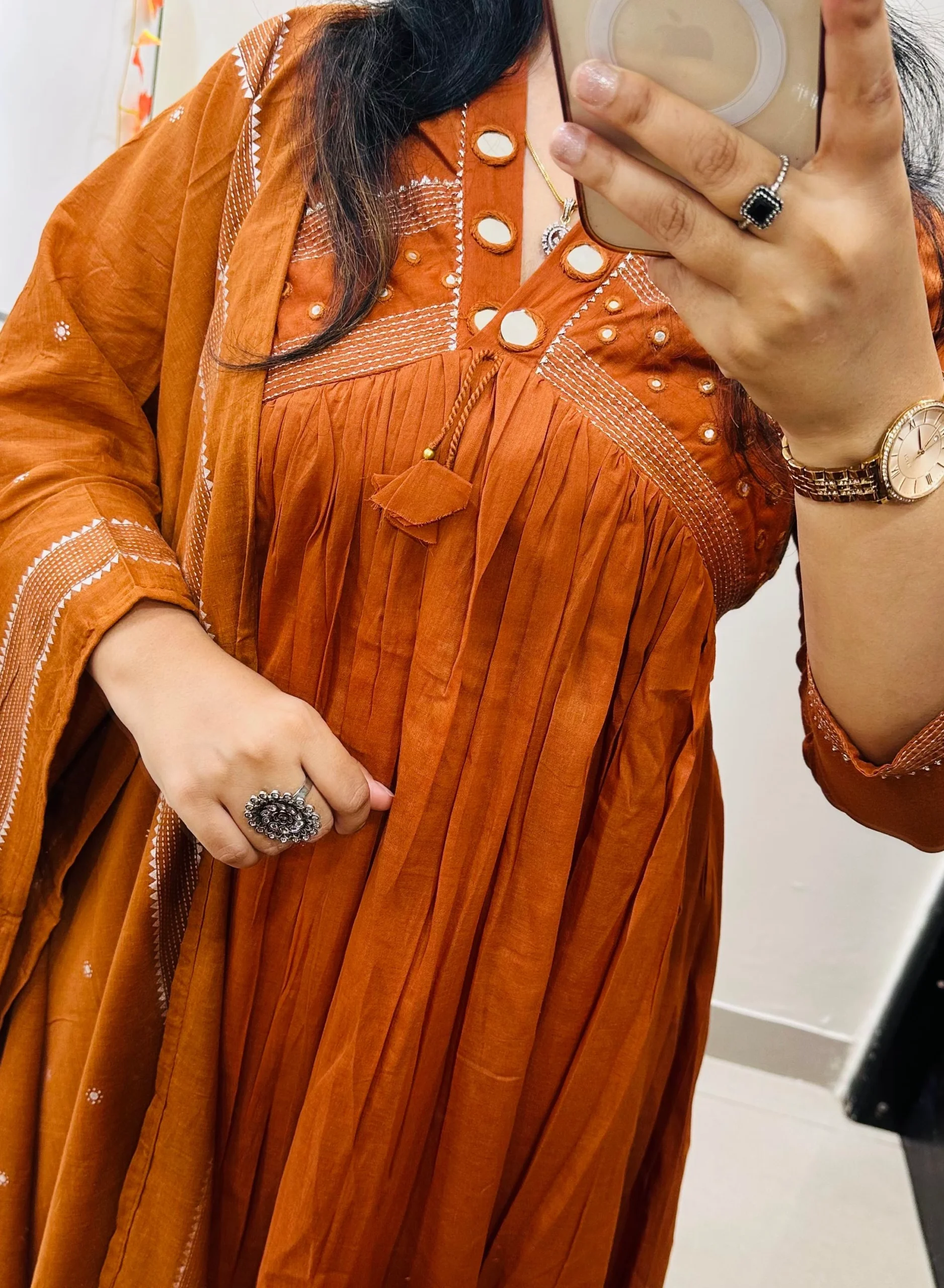 Famous Rich Mul Cotton Anarkali Suit With pant duppata Set with real mirror work in neckline and got and zari embroidery detailing in yoke with tussels.