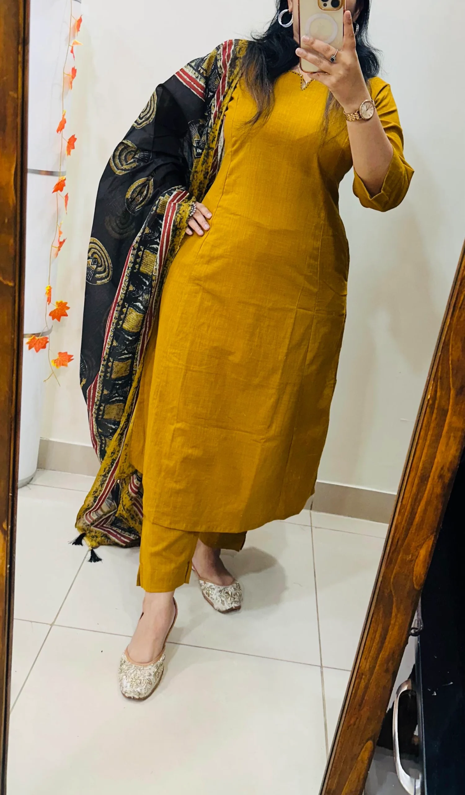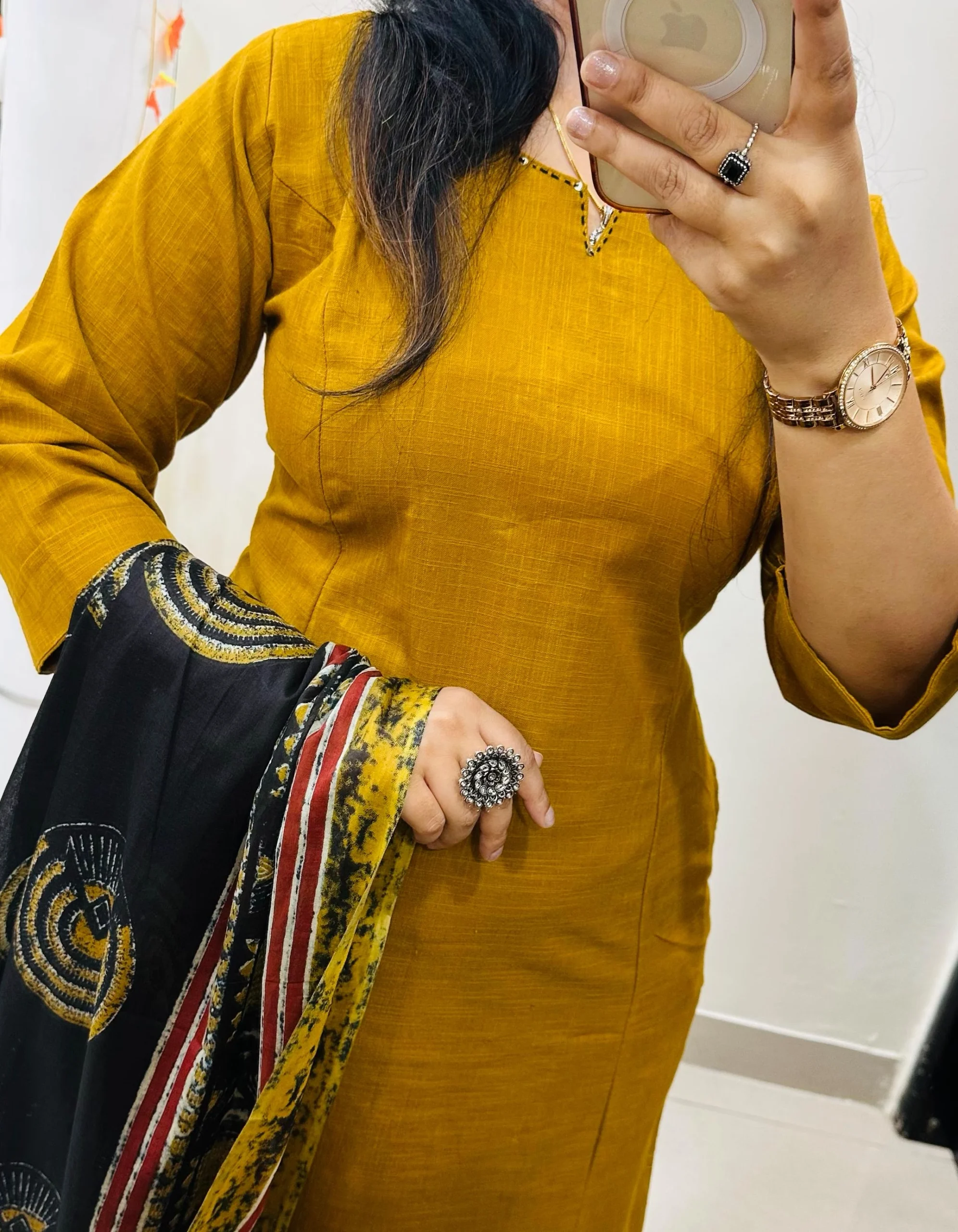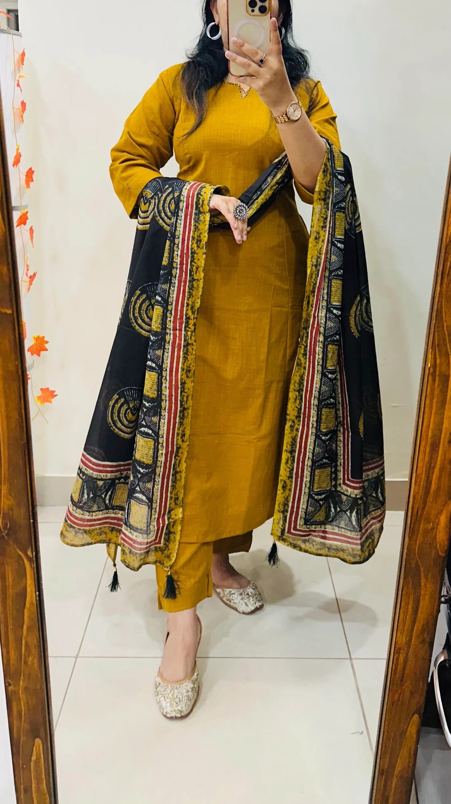 Beautiful kurti Pant dupatta set in Premium Cotton Slub in Princesss cut Aline kurti with sequin detailing in neckline with cotton dupatta with tussels