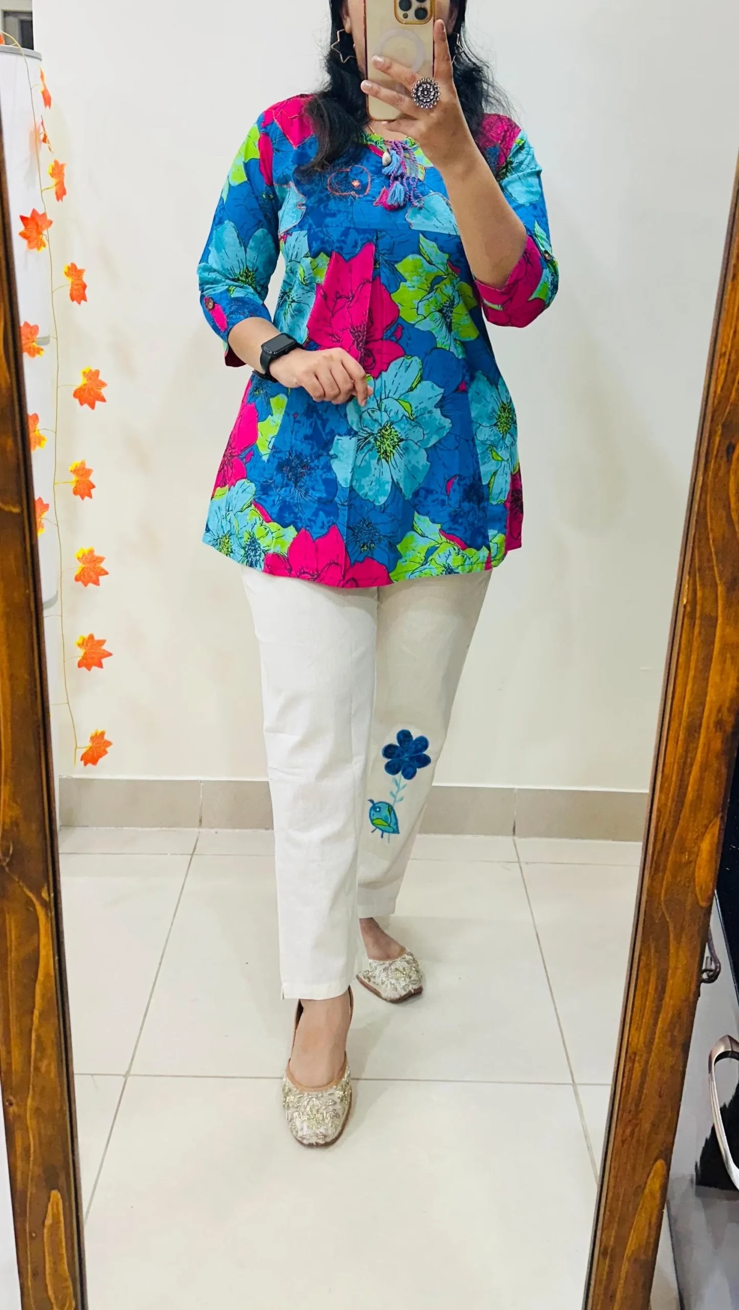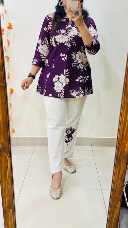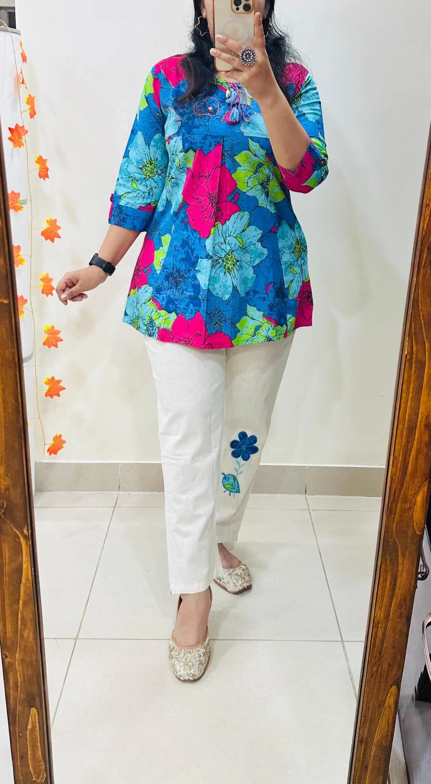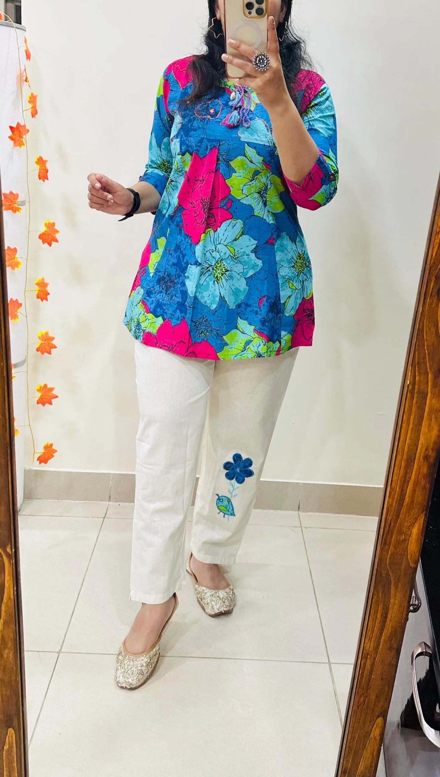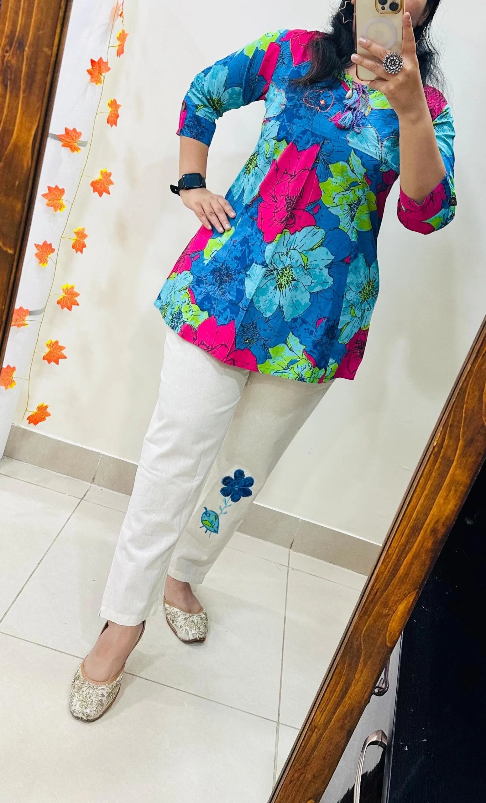 Top Bottom Set with beautiful Applique with embroidery detailing work in Flex Cotton Pant ..