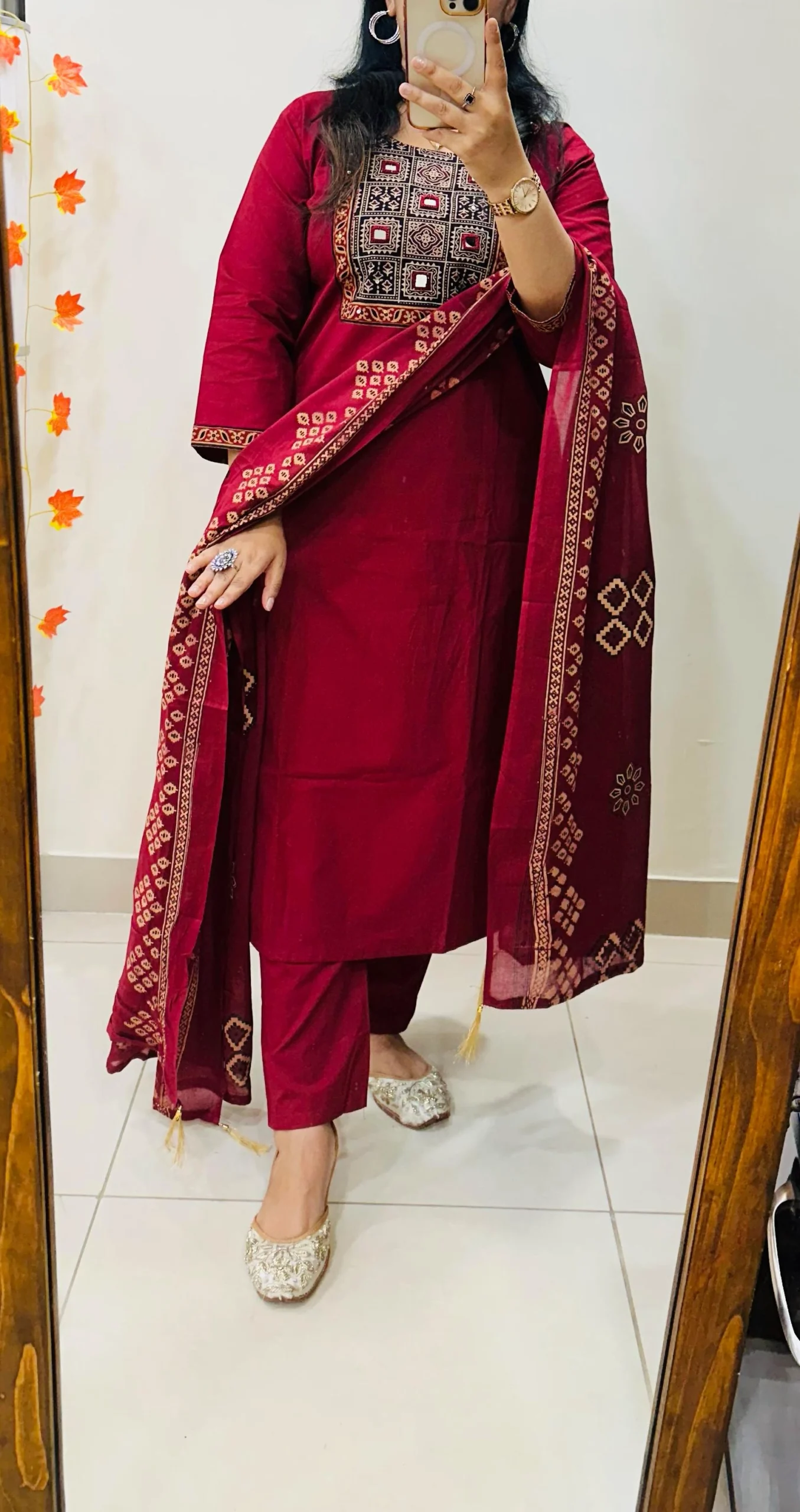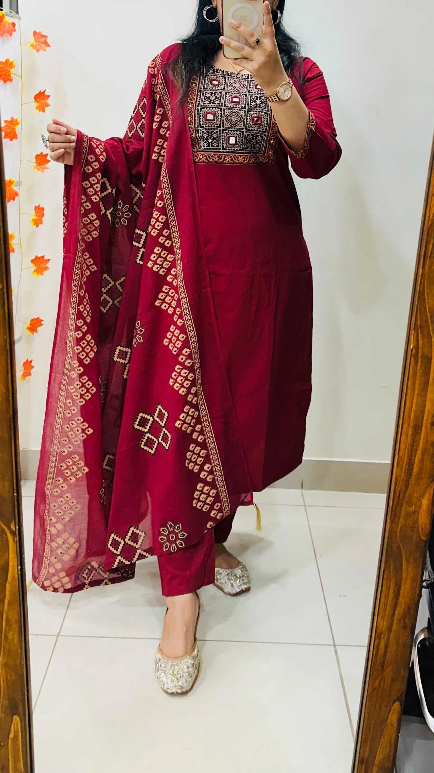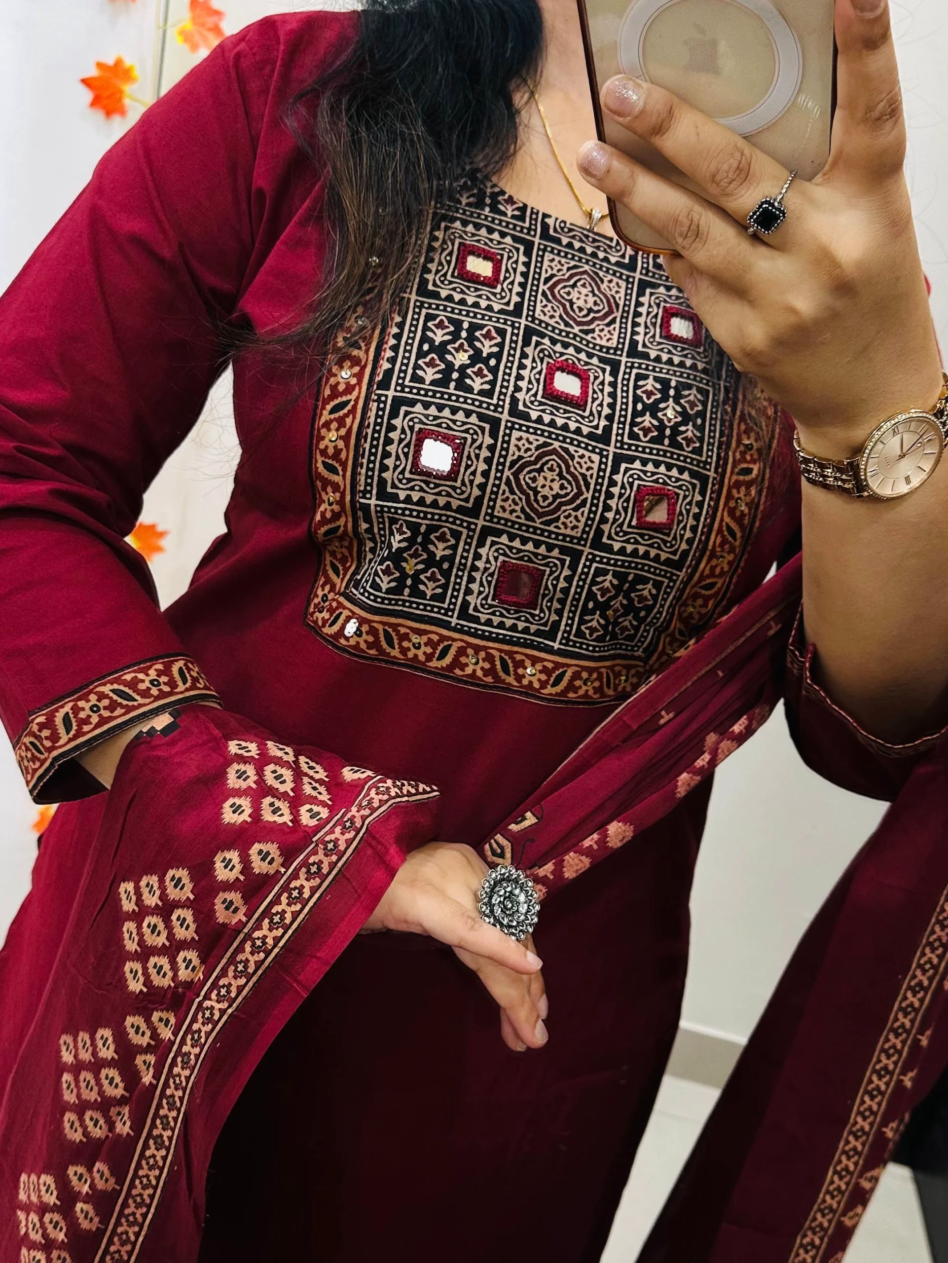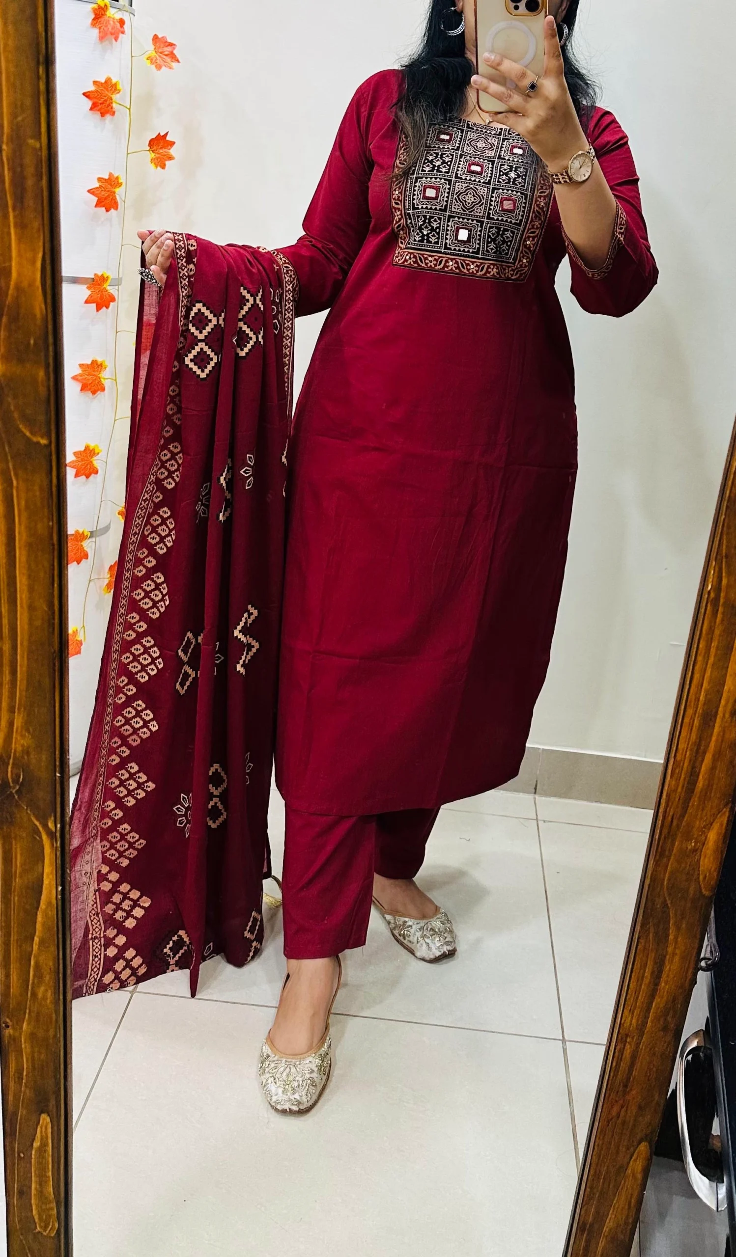 Beautiful kurti Pant dupatta set in Premium Dhabu Cotton with azrakh patch work in yoke with real mirror and sequin detailing paired with cotton dupatta
