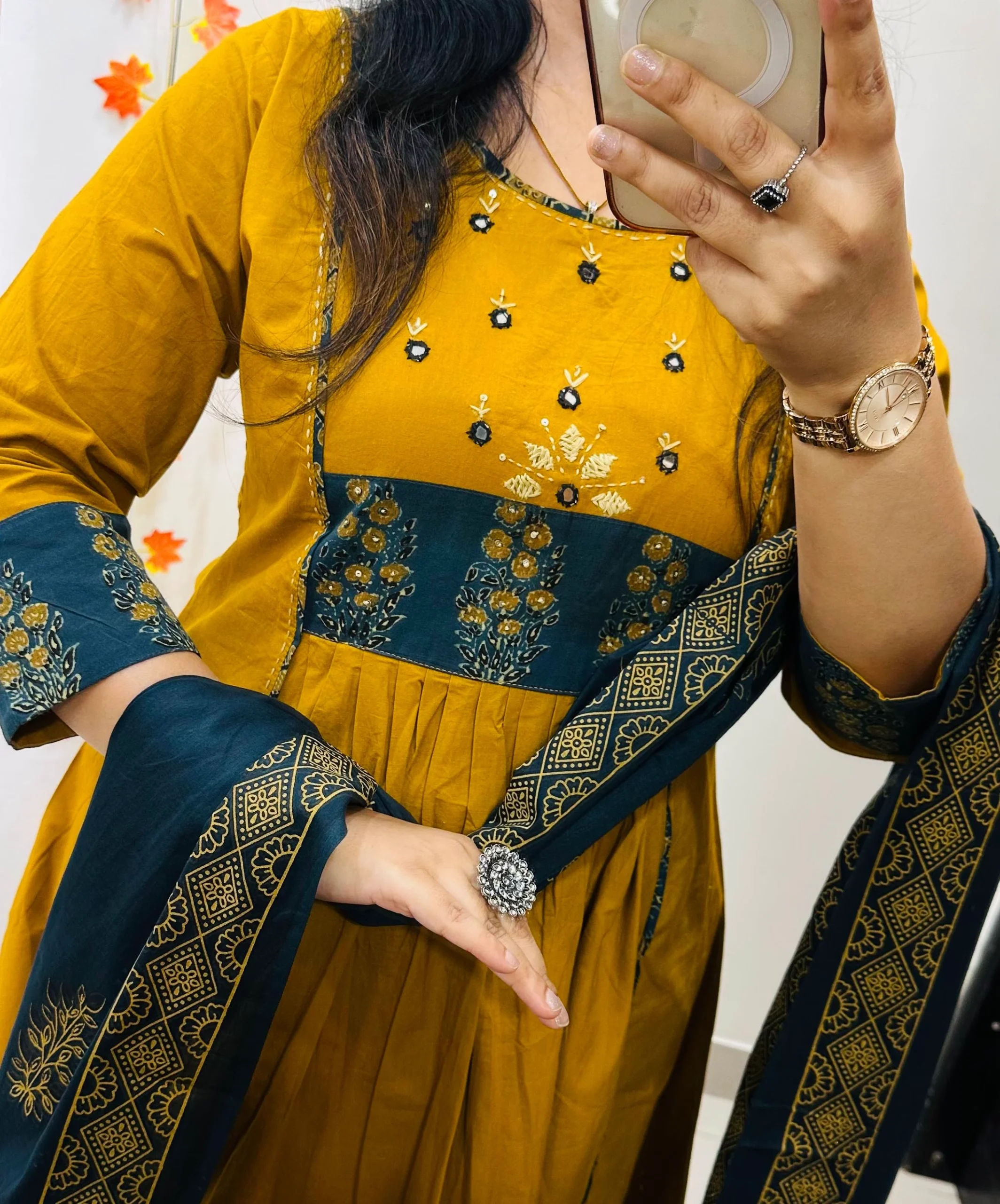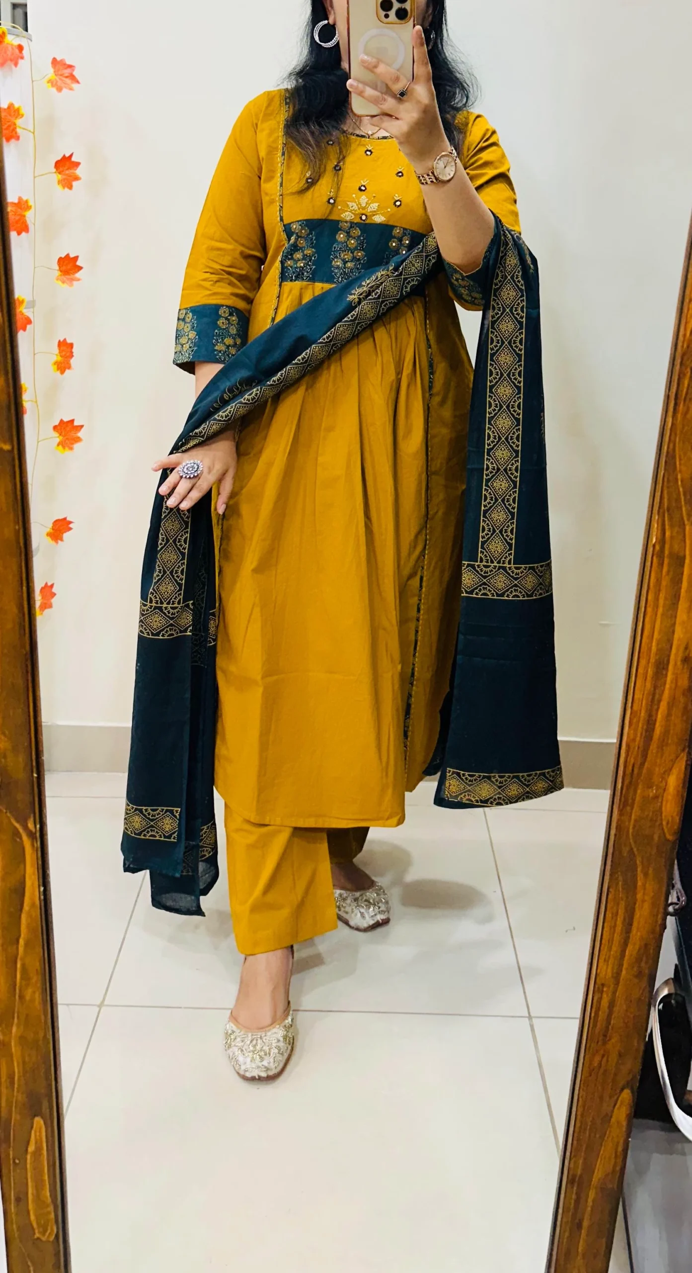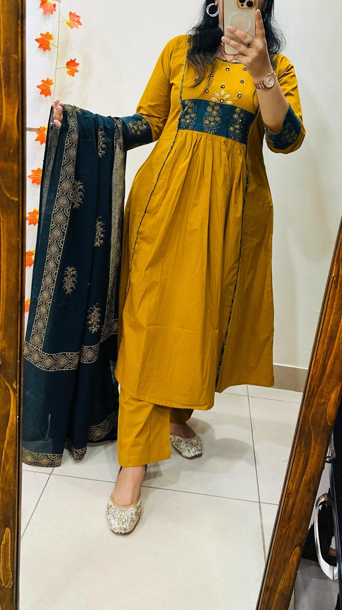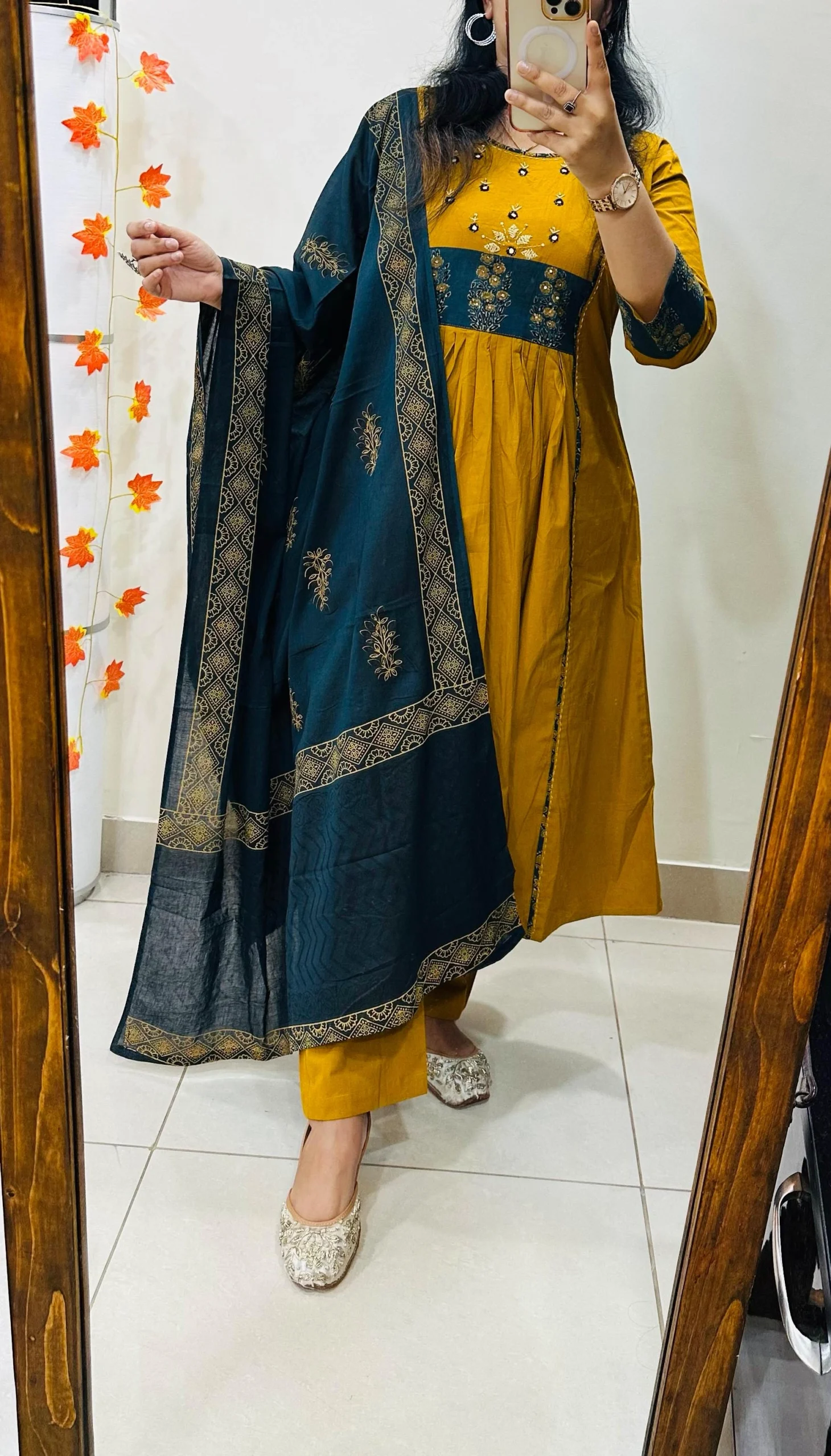 Beautiful Anarkali kurti Pant dupatta set in Premium Pure Cotton with azrakh patch work in yoke and sleeves with real mirror and embroidery work in yoke having pure block print cotton dupatta