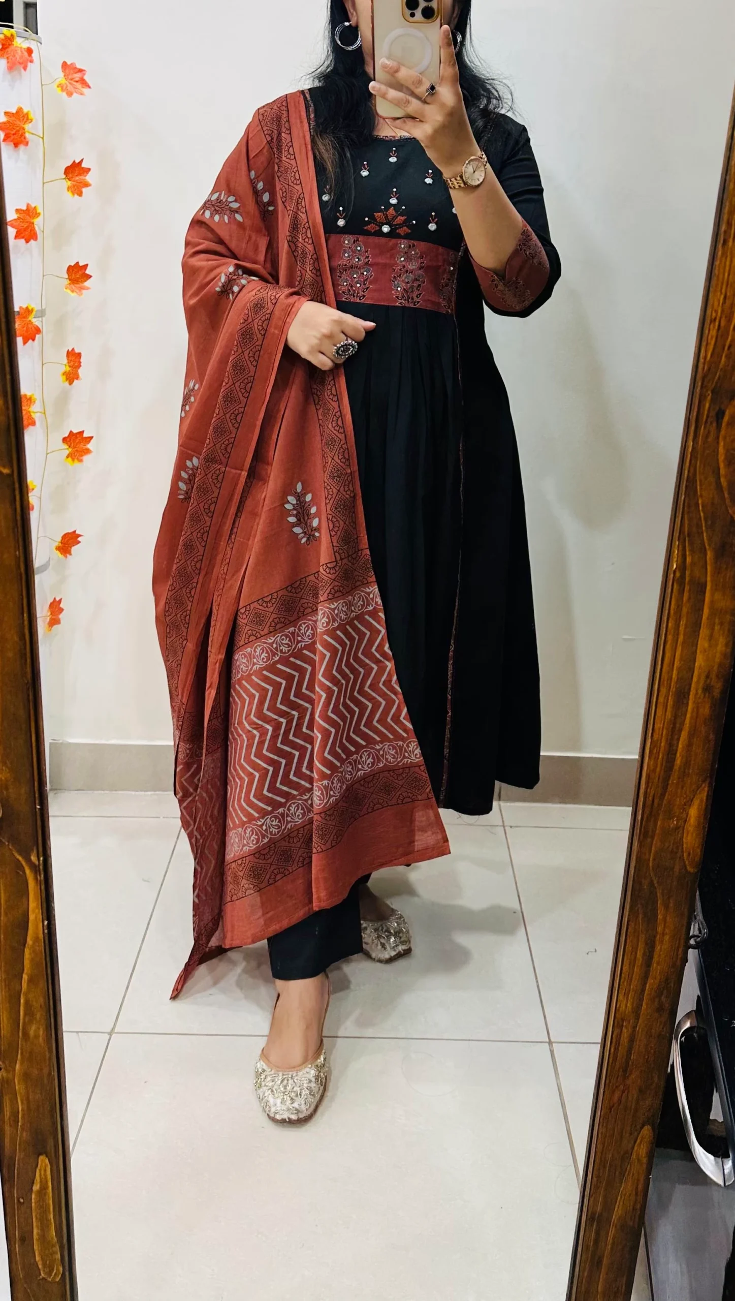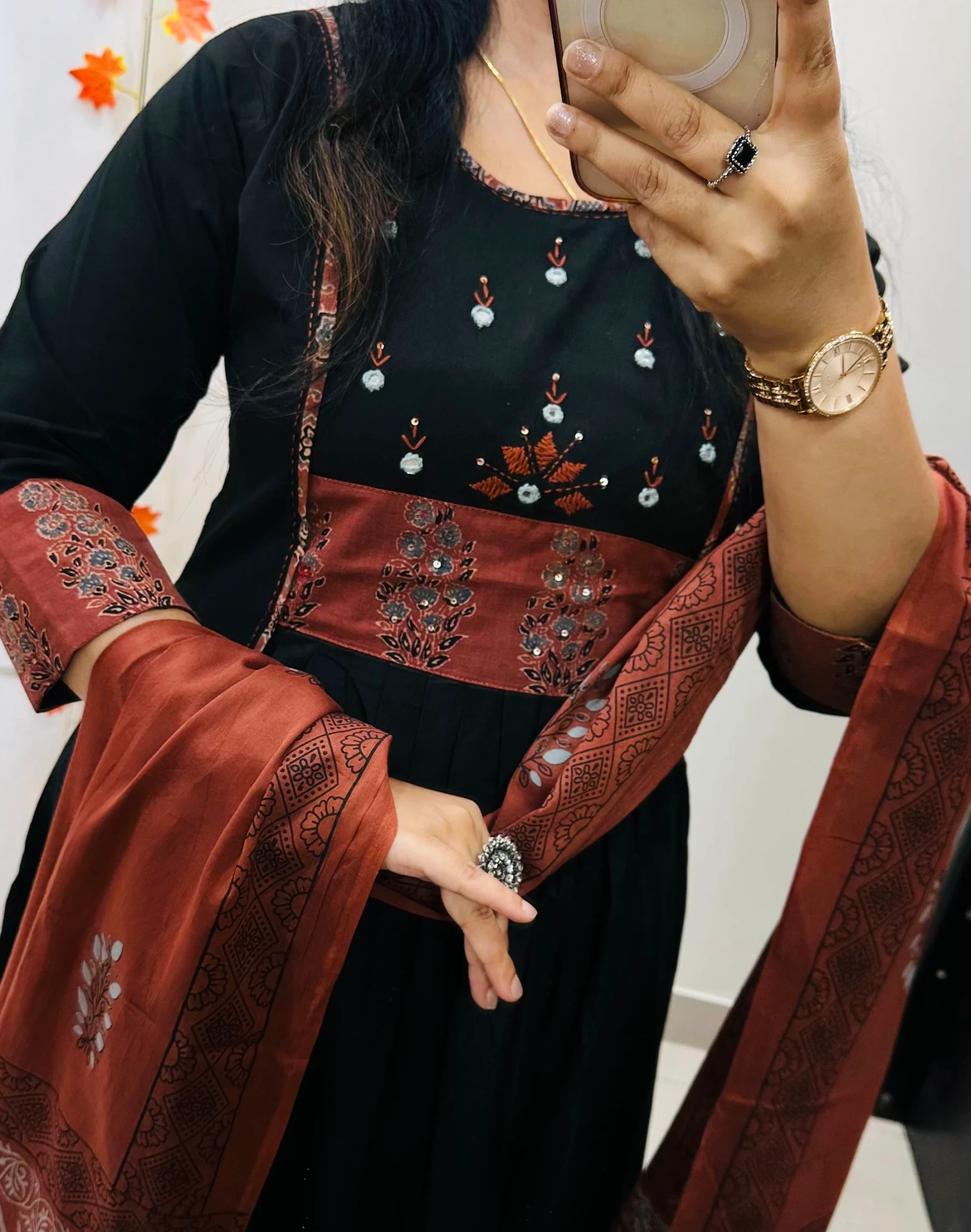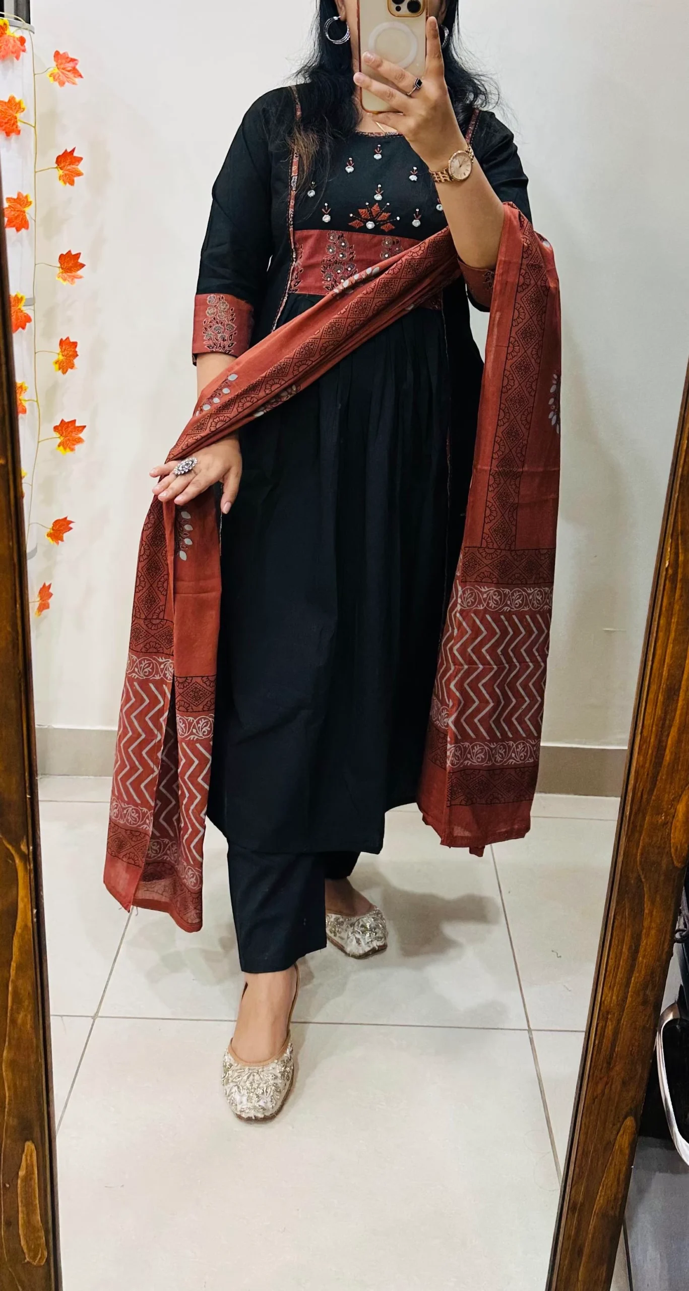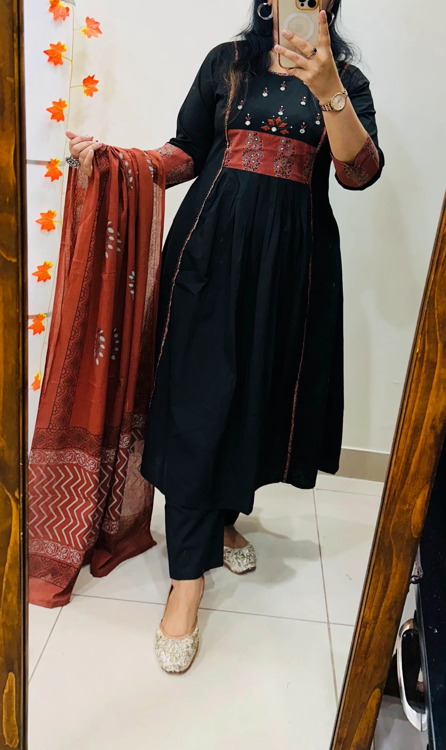 Beautiful Anarkali kurti Pant dupatta set in Premium Pure Cotton with azrakh patch work in yoke and sleeves with real mirror and embroidery work in yoke having pure block print cotton dupatta